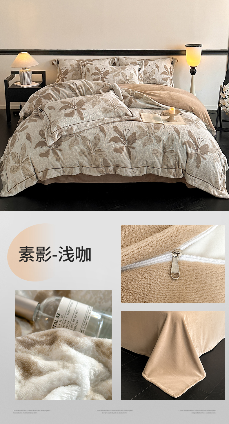 (总)盛秋家纺 2025新款佩拉着色烂花牛奶绒四件套【简约风格】,山茶花语-咖,素影-灰,馥色芬芳-粉,花溪听雨-咖,清新叶语-浅咖,山茶花语-粉,山茶花语-蓝,素影-浅咖