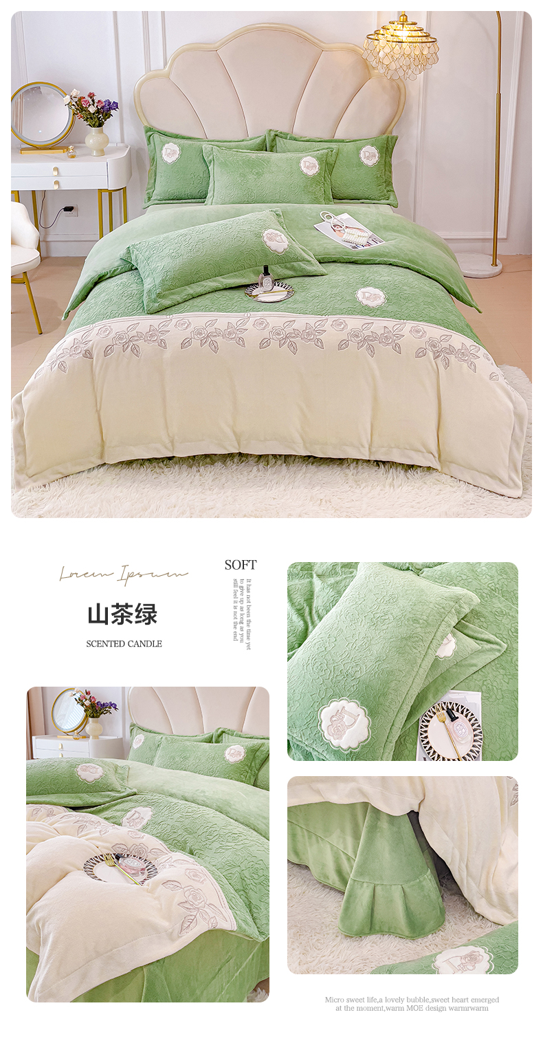 商品名称:梵克保罗 2025秋冬新款牛奶绒雕花双拼拼接刺绣款四件套-维多利亚(含买家秀) 维多利亚-山茶绿