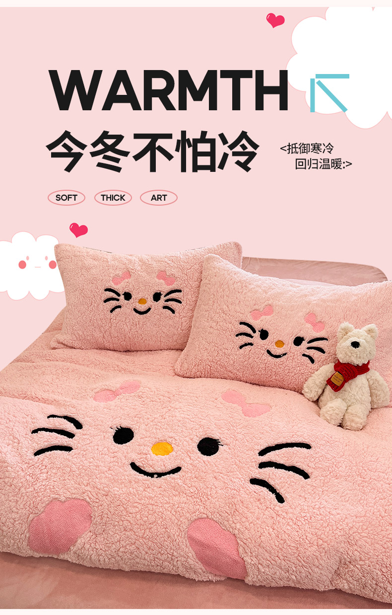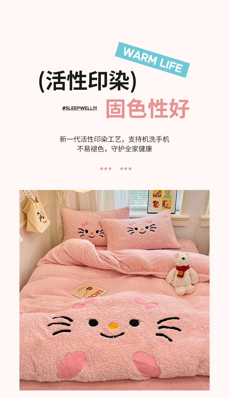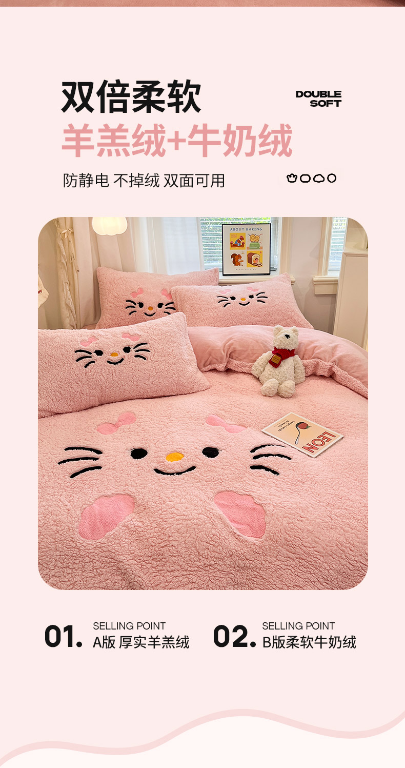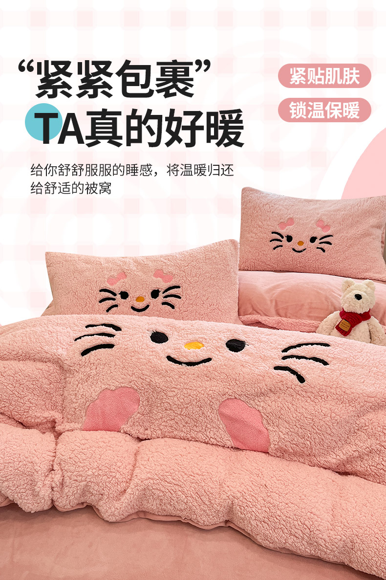 商品名称:梓之赫 2025新款大版羊羔绒牛奶绒卡通四件套冬季加厚保暖 可爱猫咪-粉