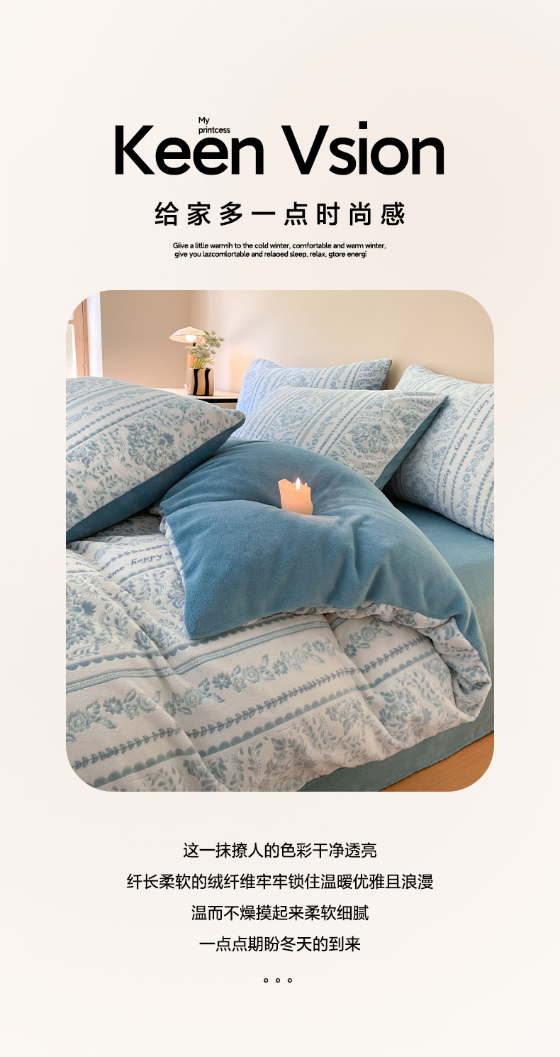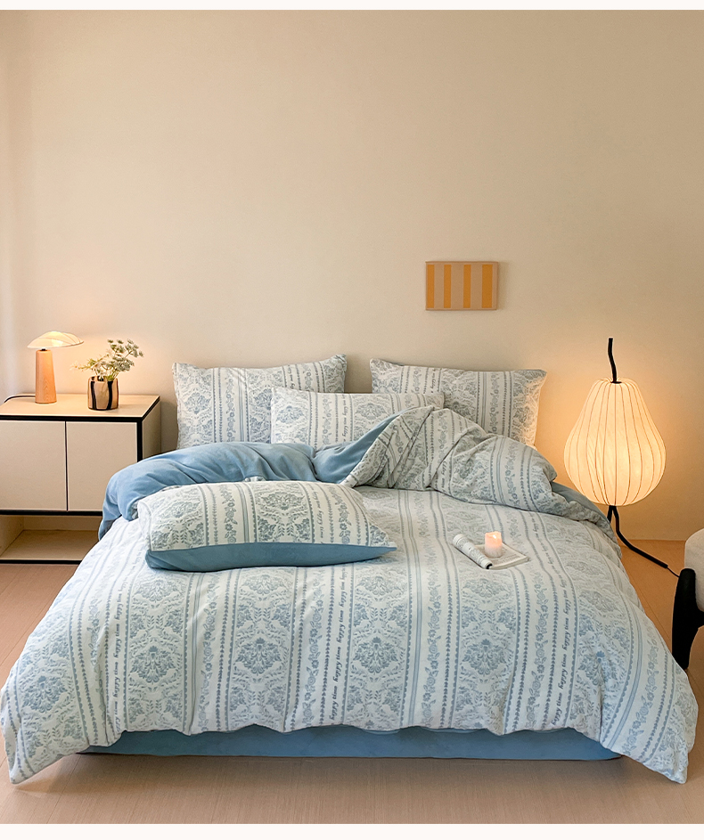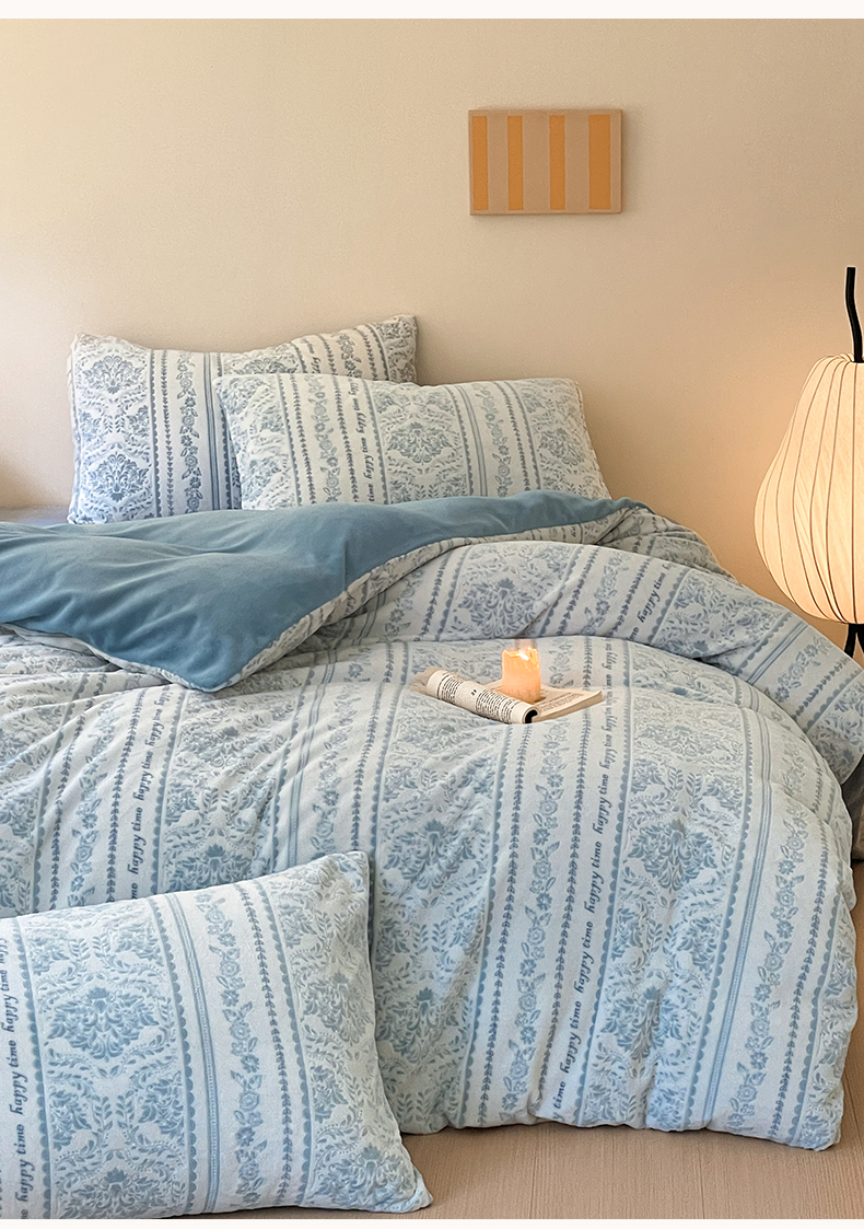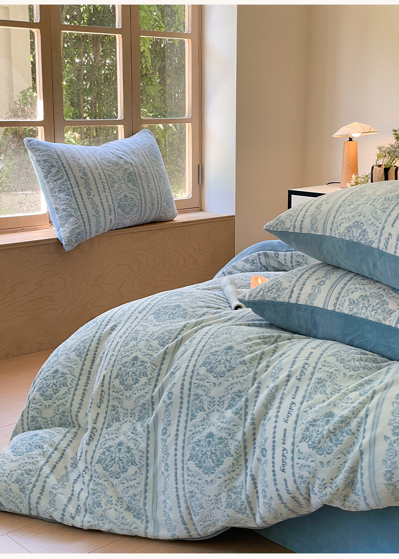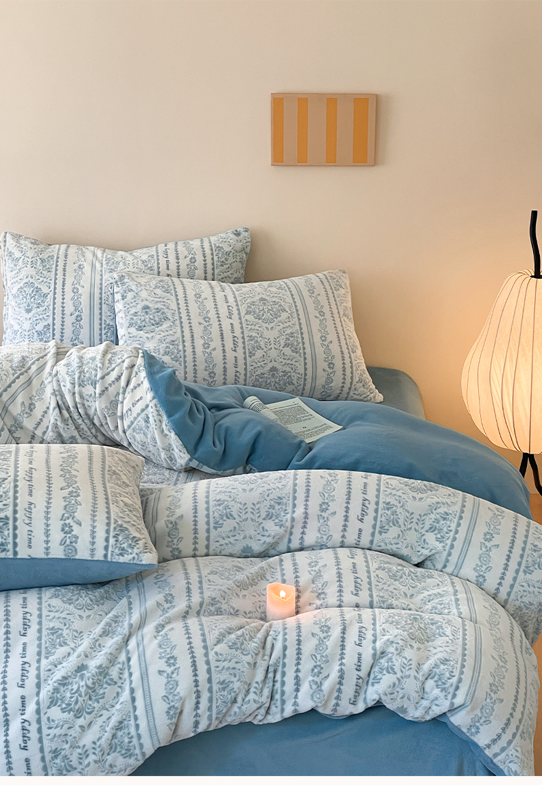 雅居纺家纺 2025新款花卉雕花绒加厚保暖四件套 法式风情-蓝