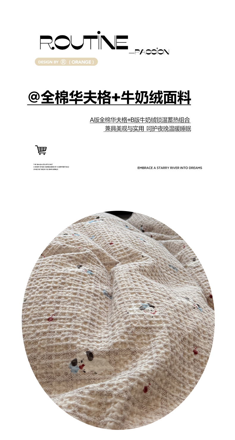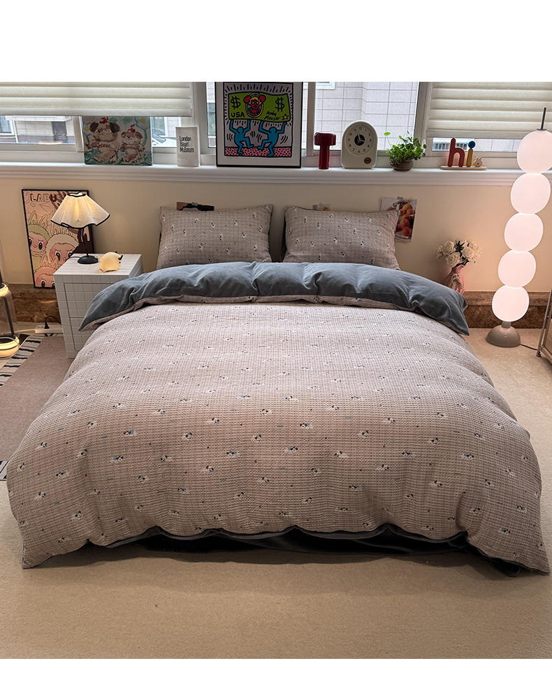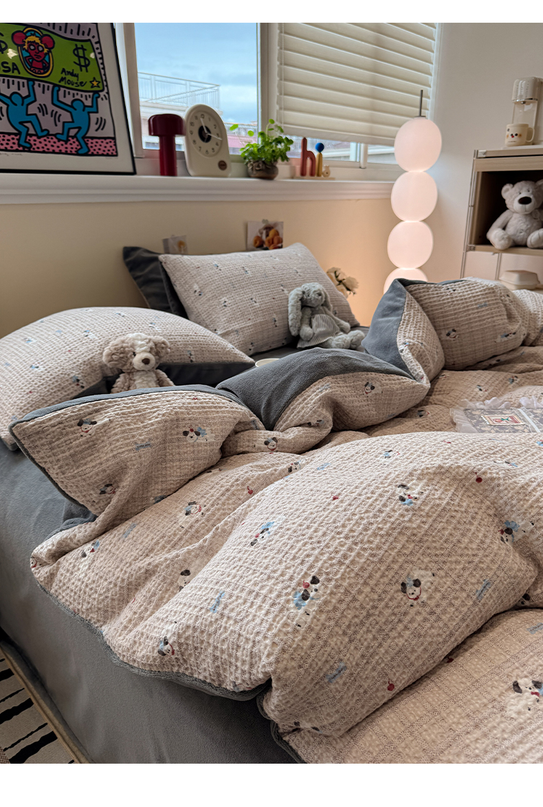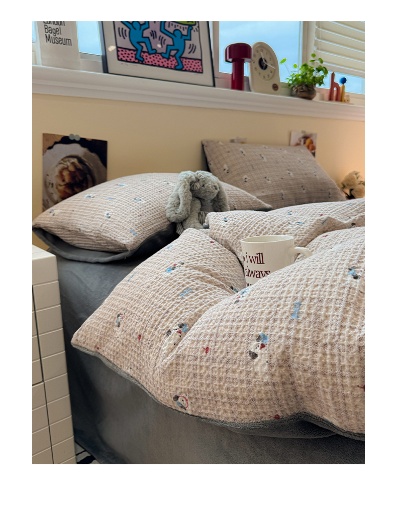 当前位置: 91家纺网 > 商品网购 > 床品套件 > 四件套 > 全棉普通四件套 > 雅居纺家纺 2025新款全棉华夫格+牛奶绒印花四件套 华夫格-牛奶绒 深灰小狗