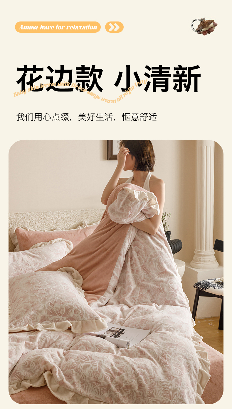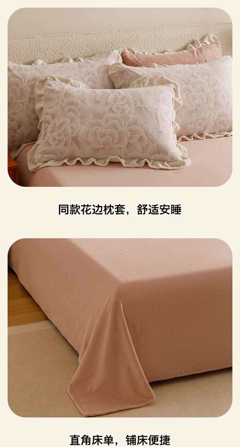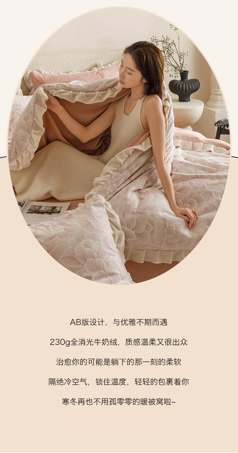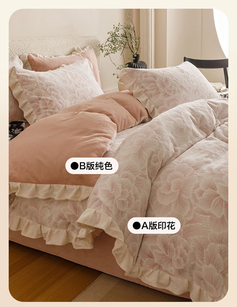 当前位置: 91家纺网 > 商品网购 > 床品套件 > 四件套 > 牛奶绒四件套 > 恬思语家纺 2025新款亲肤舒适韩风小清新花边牛奶绒四件套 百花绽放-粉