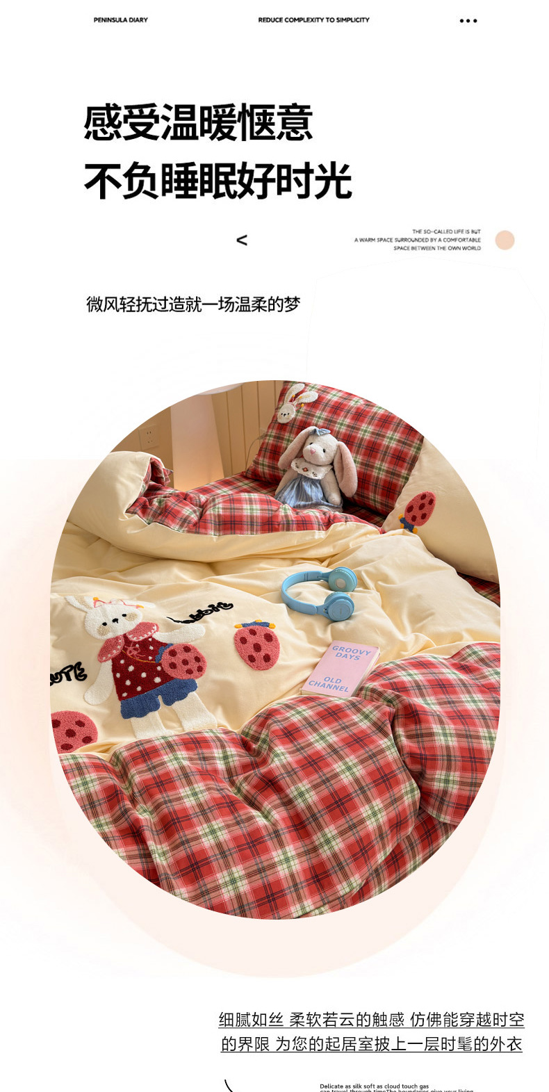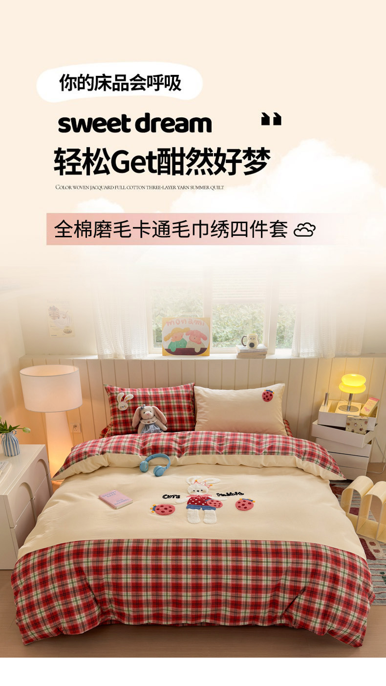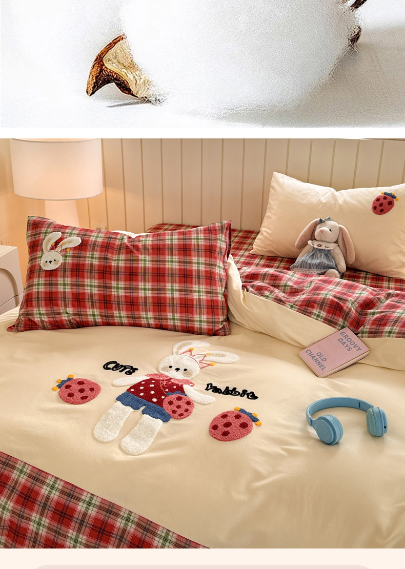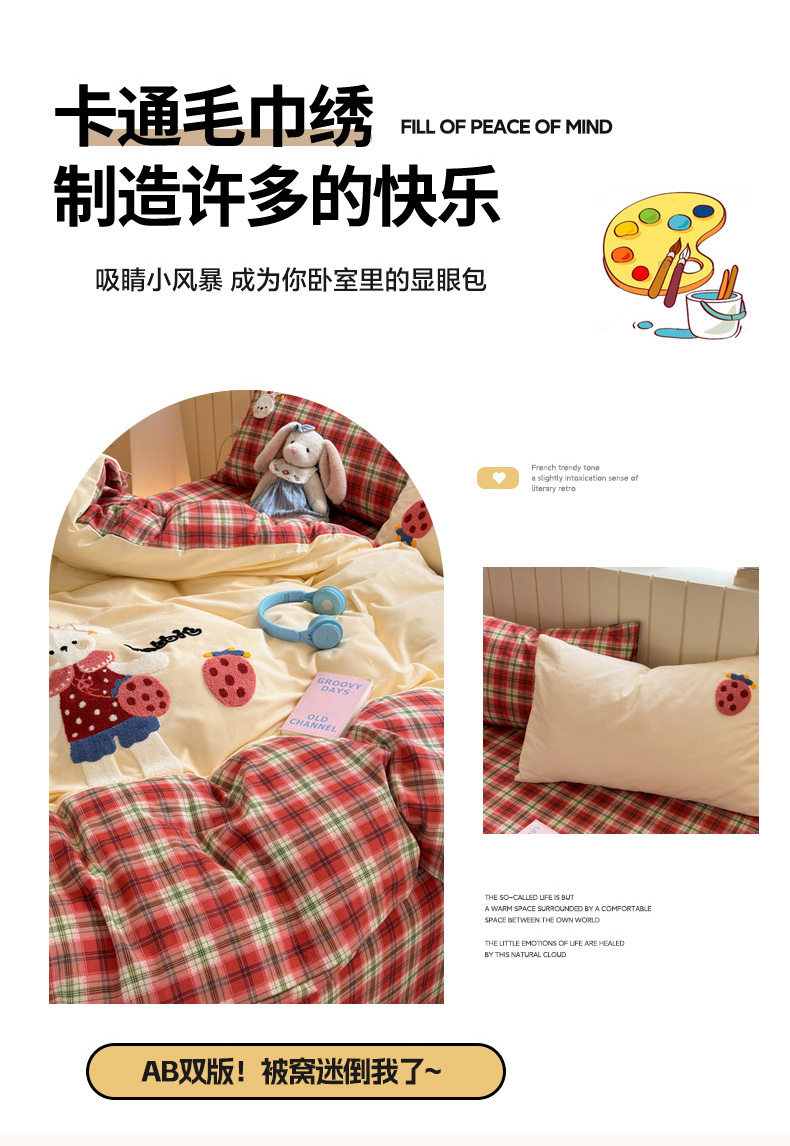 当前位置: 91家纺网 > 商品网购 > 床品套件 > 四件套 > 毛巾绣四件套 > 如意朵 2025新款全棉磨毛卡通毛巾绣四件套(专版花型)-场景二 草莓兔兔