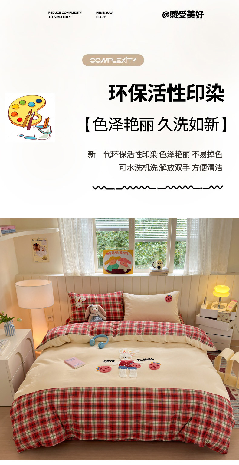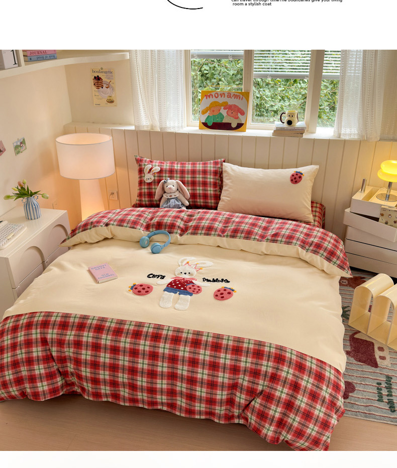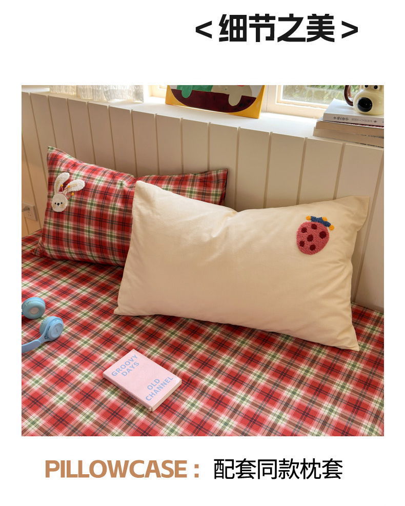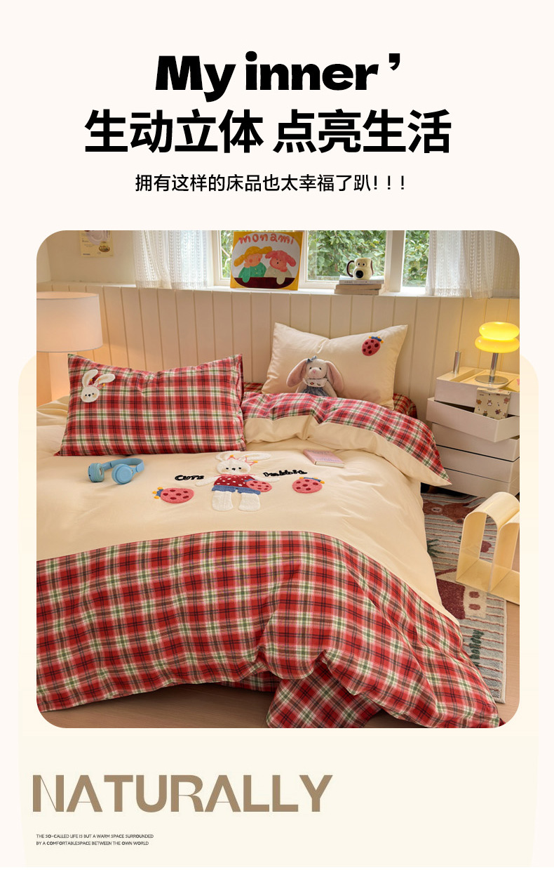 当前位置: 91家纺网 > 商品网购 > 床品套件 > 四件套 > 毛巾绣四件套 > 如意朵 2025新款全棉磨毛卡通毛巾绣四件套(专版花型)-场景二 草莓兔兔