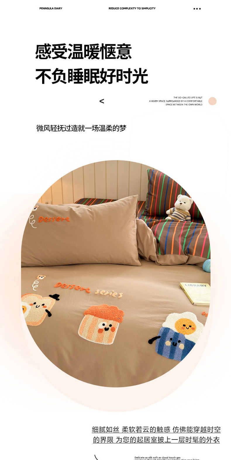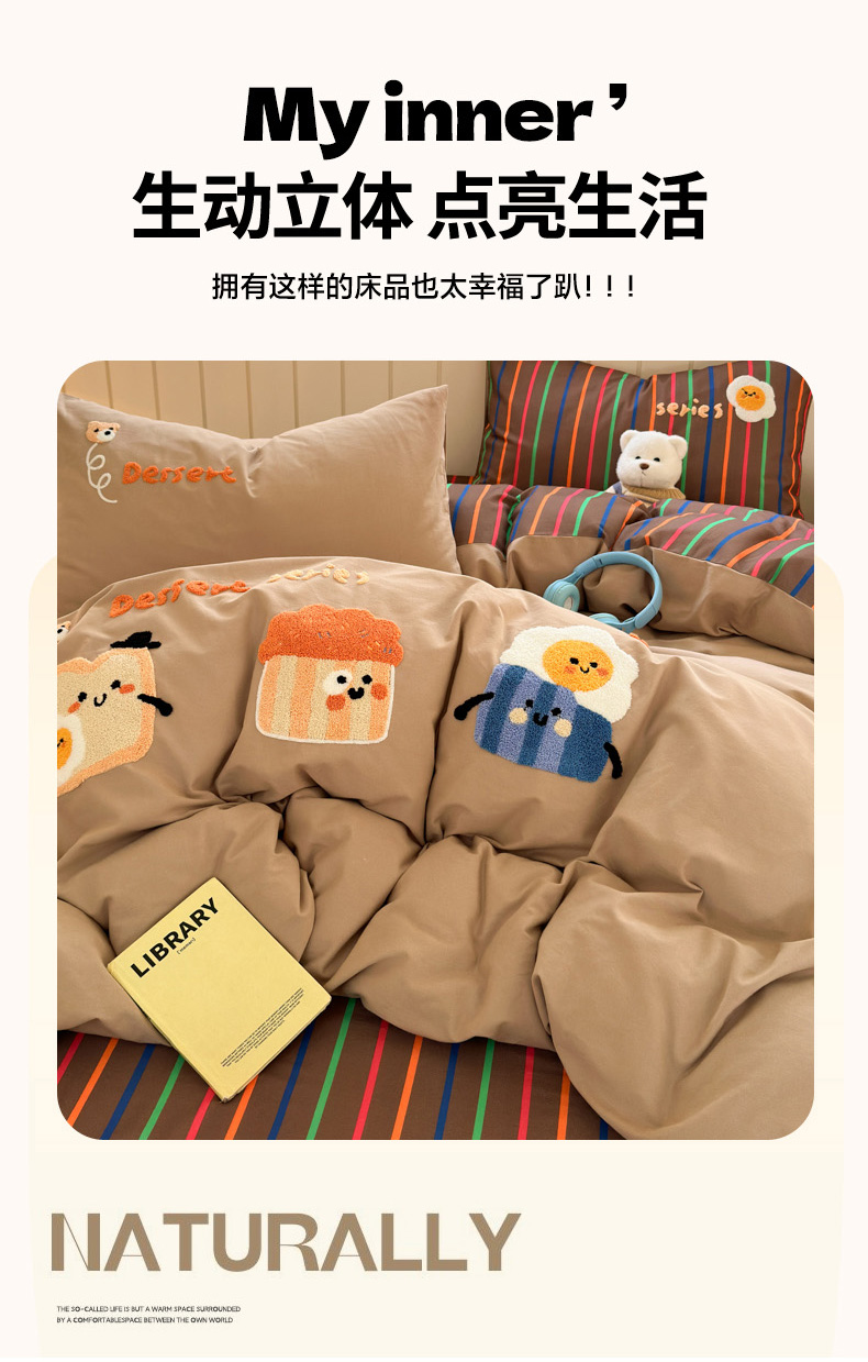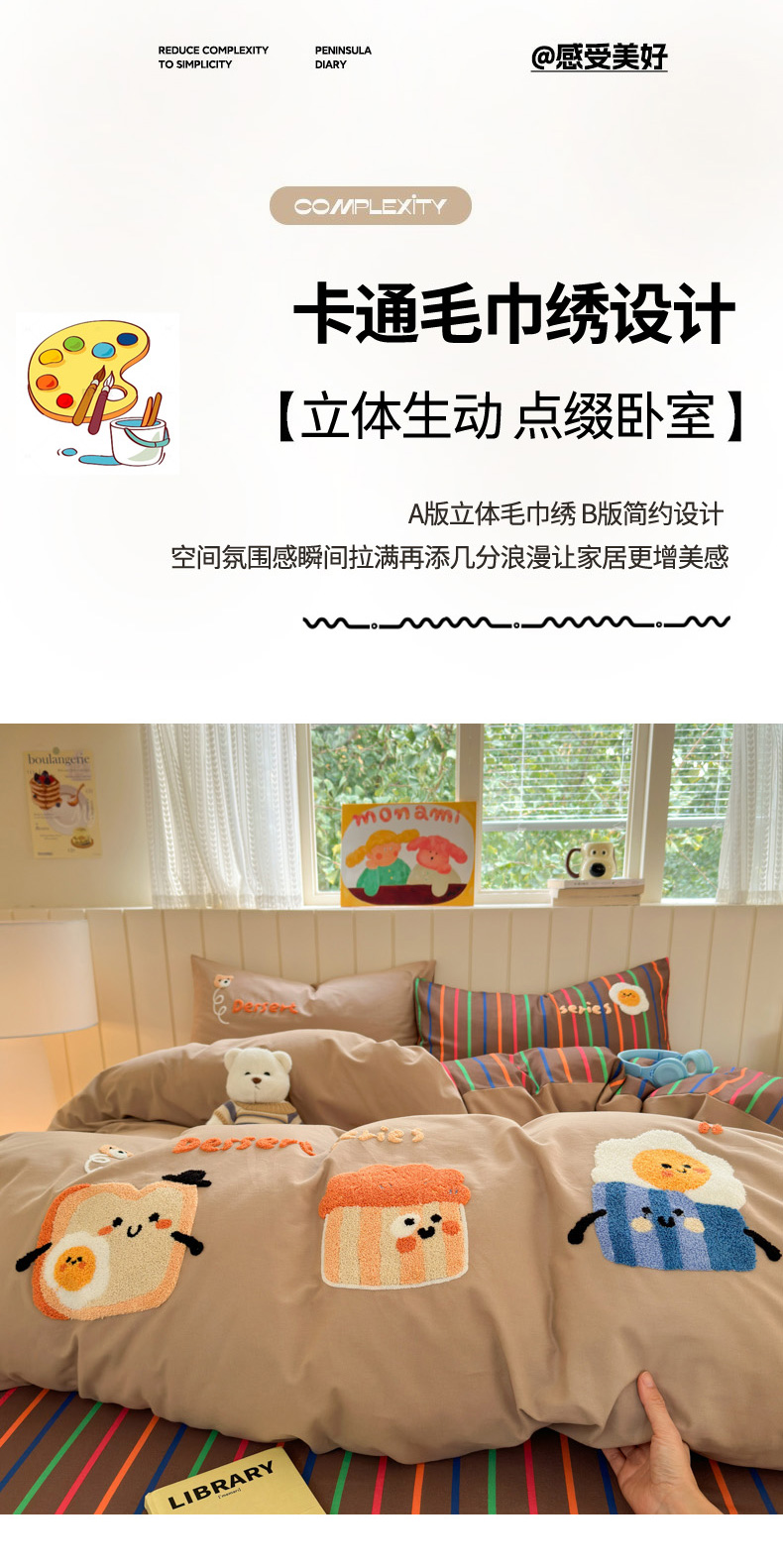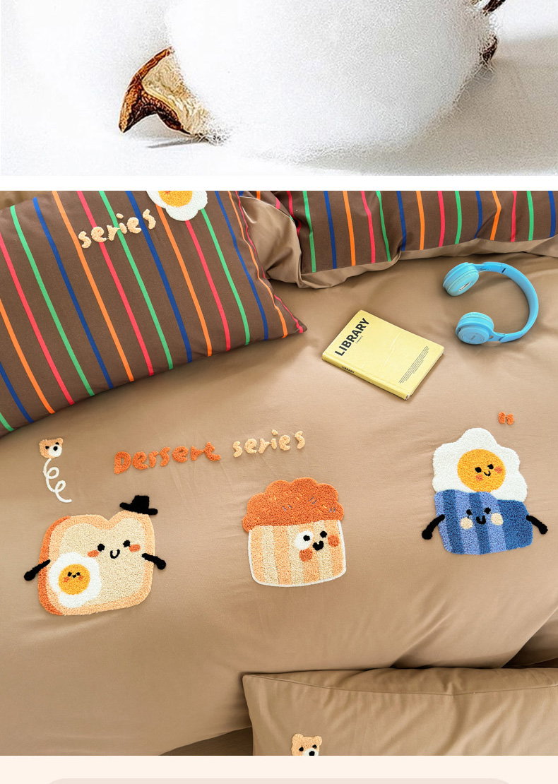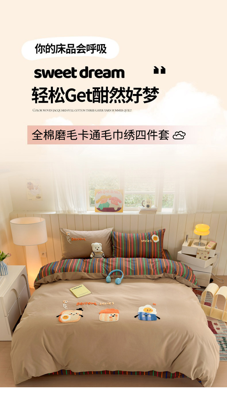 当前位置: 91家纺网 > 商品网购 > 床品套件 > 四件套 > 毛巾绣四件套 > 如意朵 2025新款全棉磨毛卡通毛巾绣四件套(专版花型)-场景二 美味吐司
