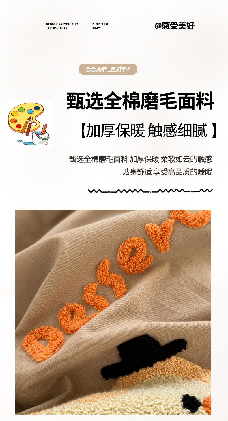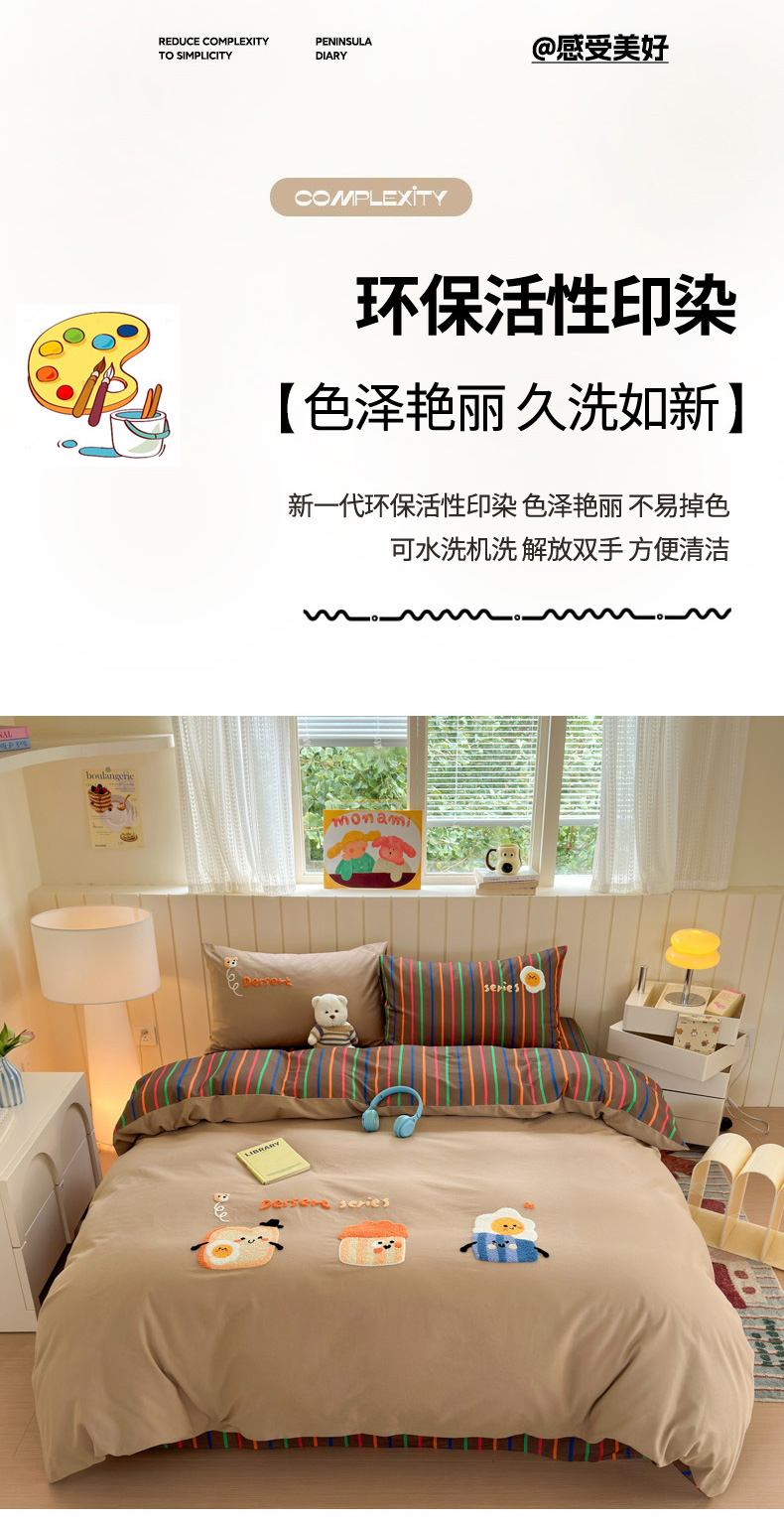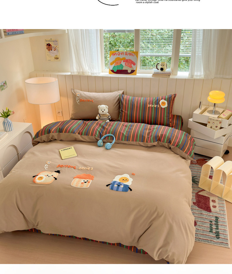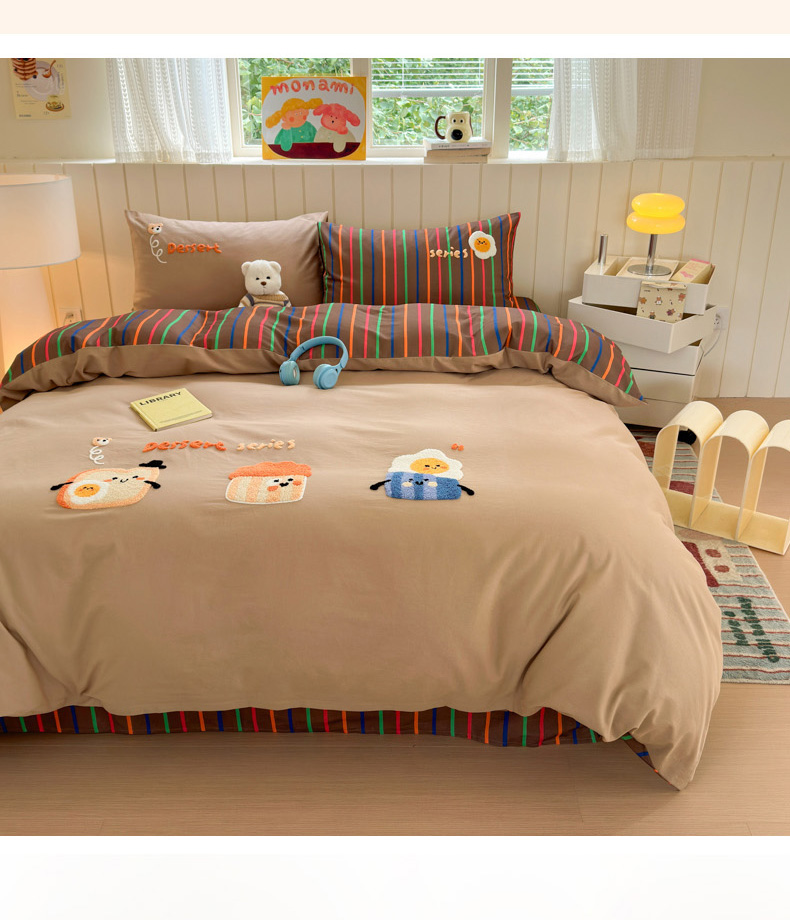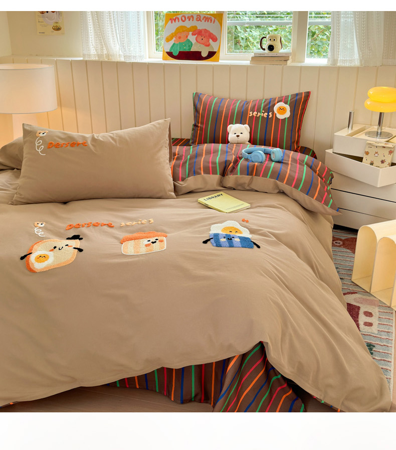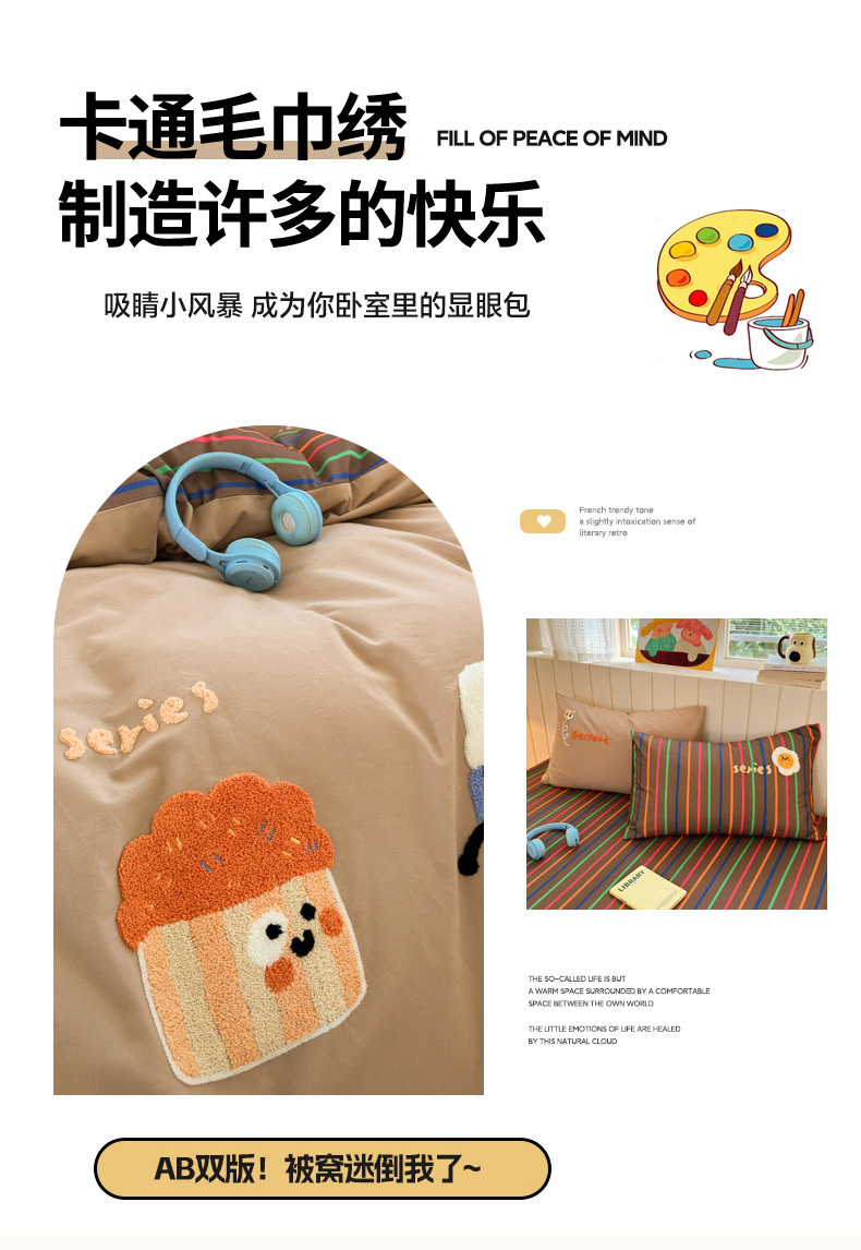 当前位置: 91家纺网 > 商品网购 > 床品套件 > 四件套 > 毛巾绣四件套 > 如意朵 2025新款全棉磨毛卡通毛巾绣四件套(专版花型)-场景二 美味吐司