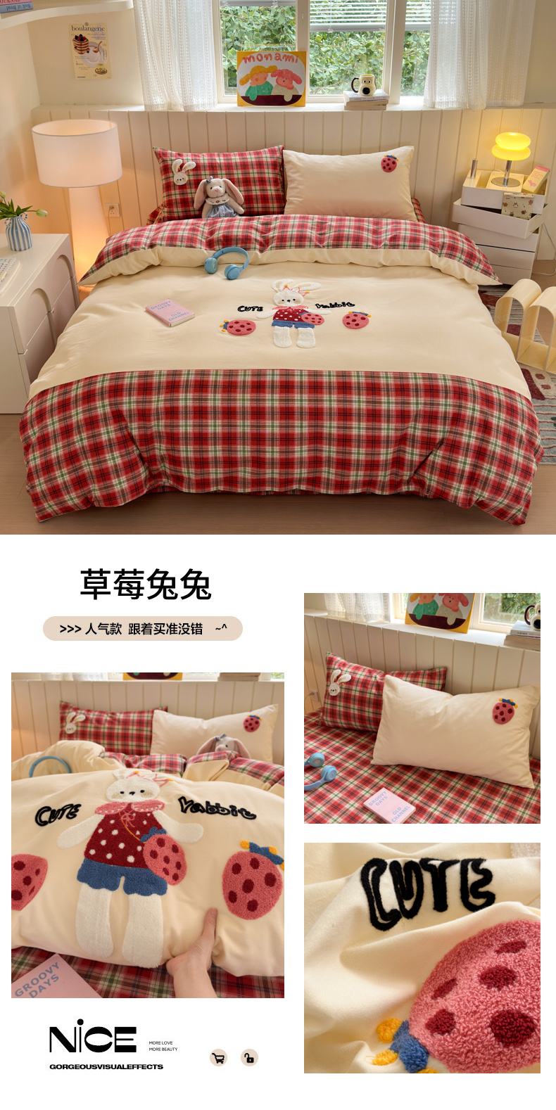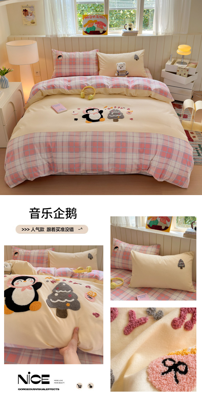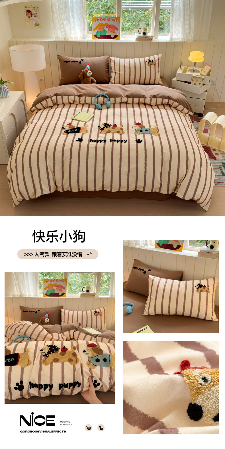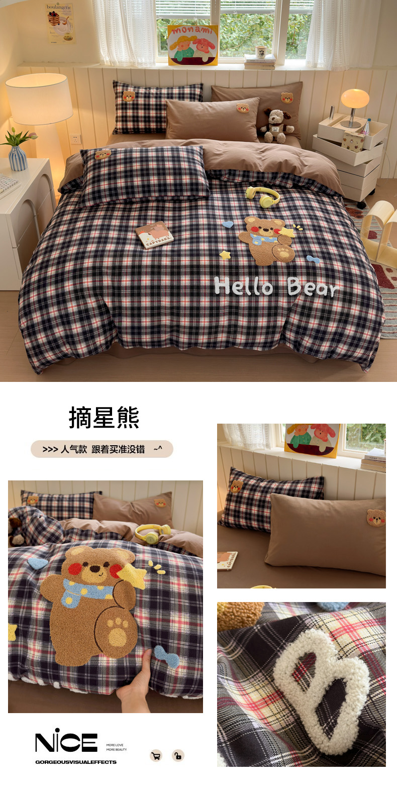 当前位置: 91家纺网 > 商品网购 > 床品套件 > 四件套 > 毛巾绣四件套 > 如意朵 2025新款全棉磨毛卡通毛巾绣四件套(专版花型)-场景二 美味吐司