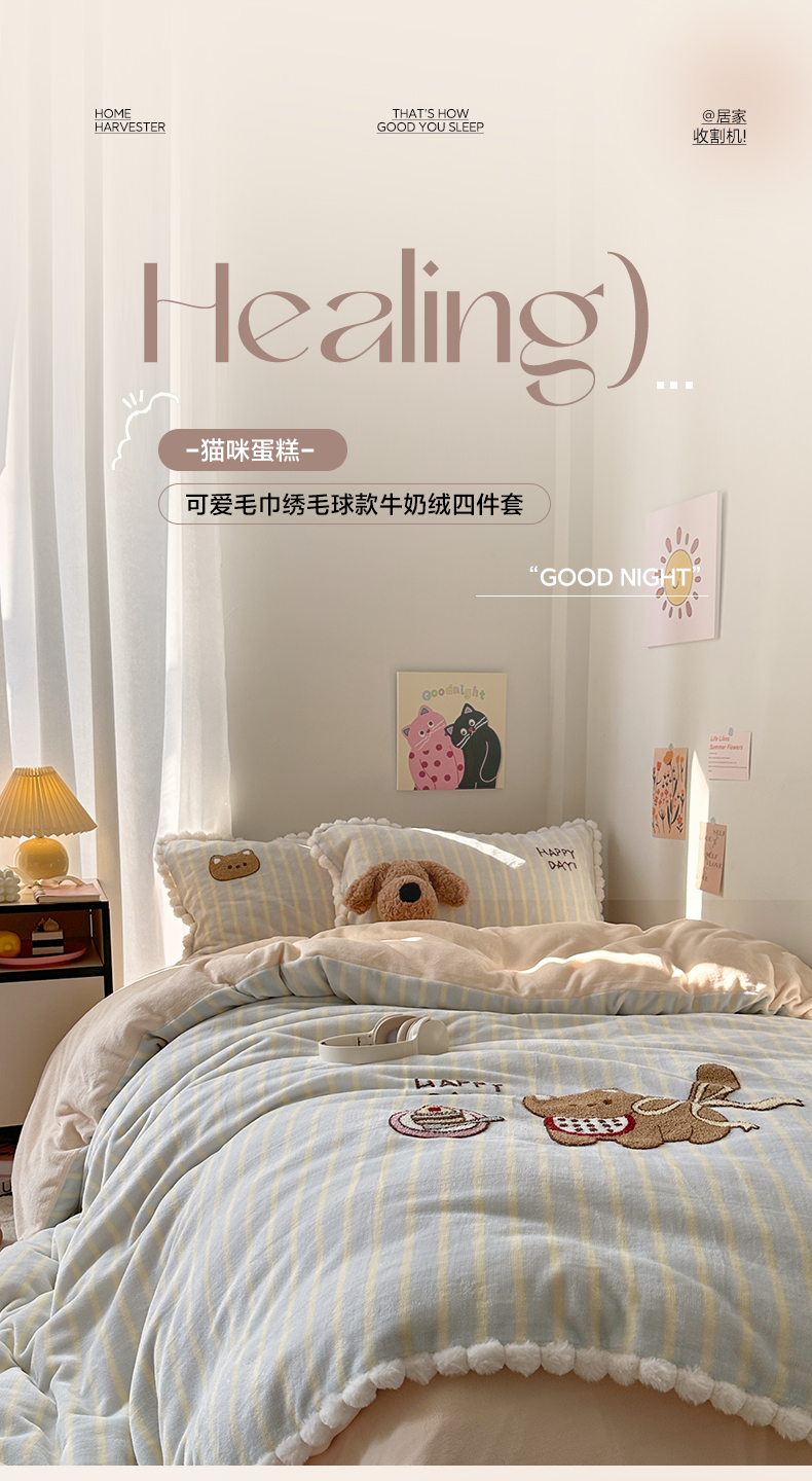 艾咪-Amy ntmy 2025新款可爱毛巾绣毛球款牛奶绒四件套-蛋糕猫咪 蛋糕猫咪-蓝