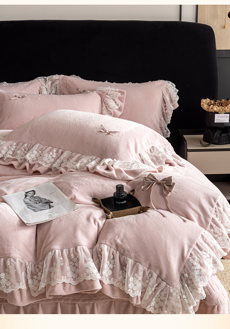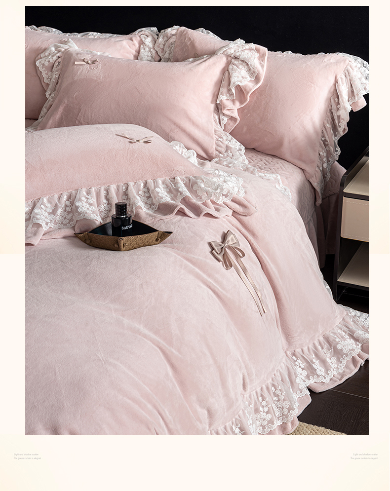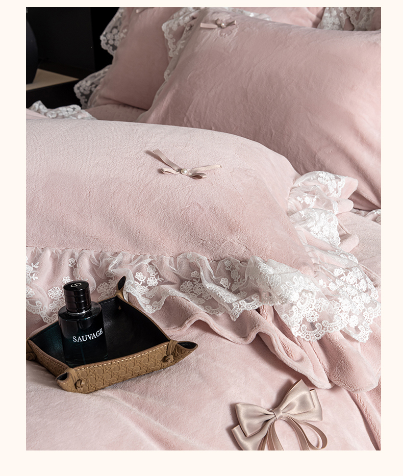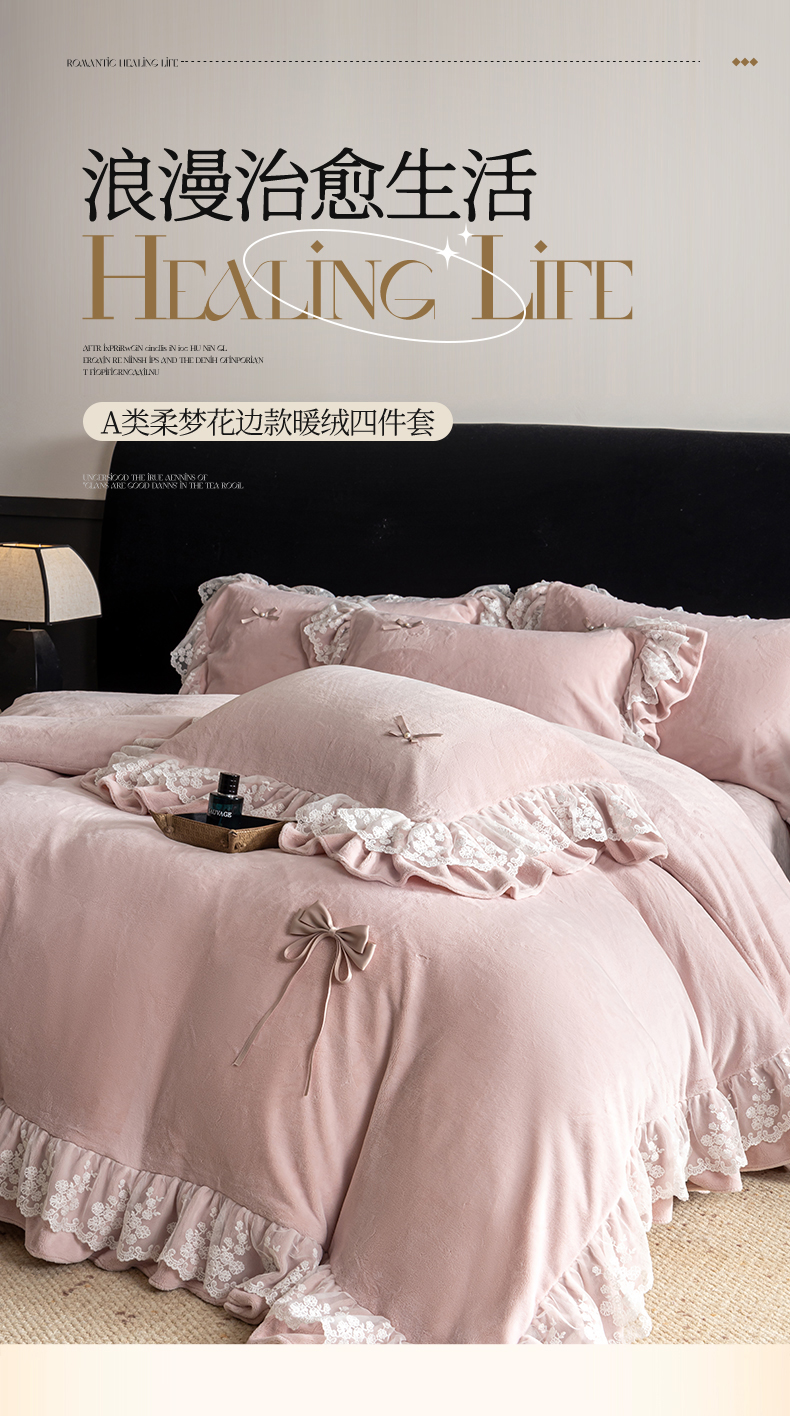 罗优家纺 2025新款柔梦花边款暖绒四件套 甜梦粉