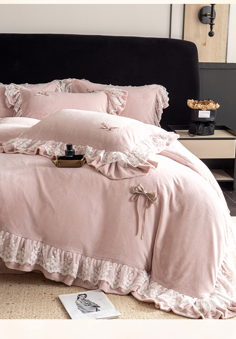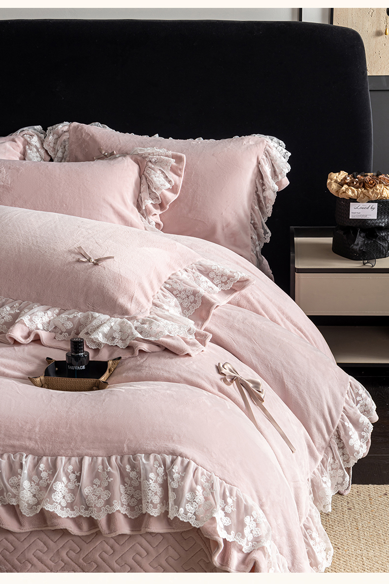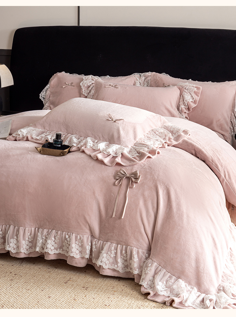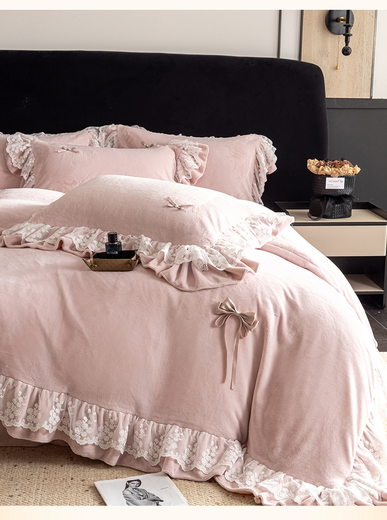 罗优家纺 2025新款柔梦花边款暖绒四件套 甜梦粉