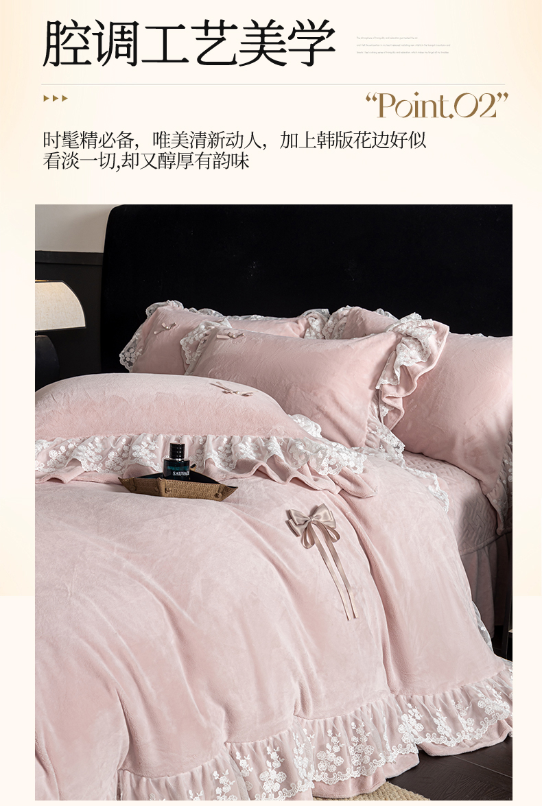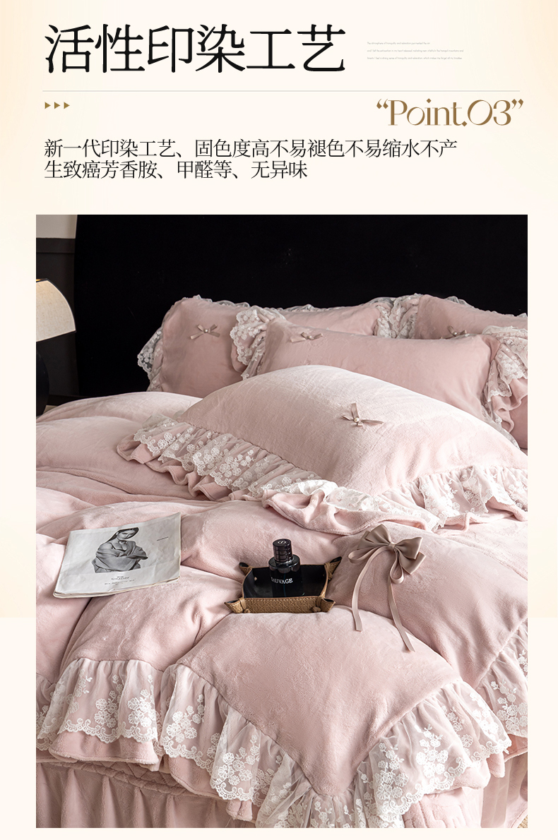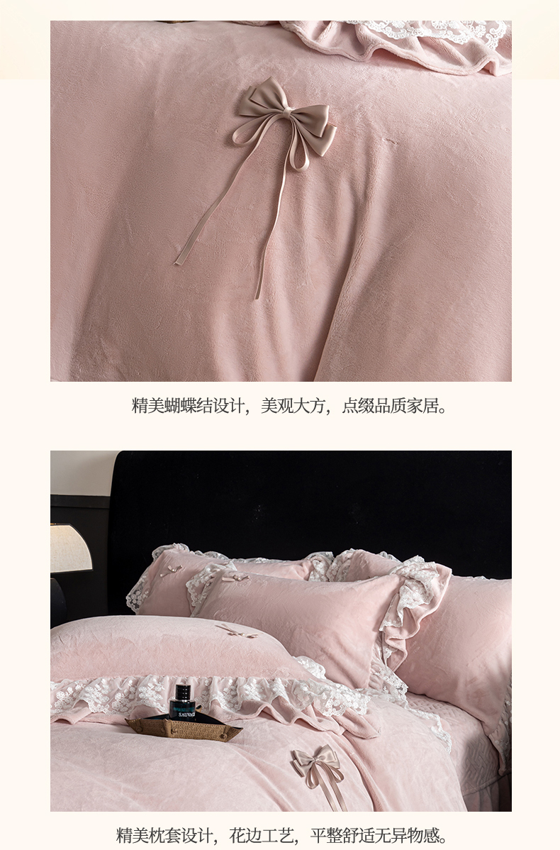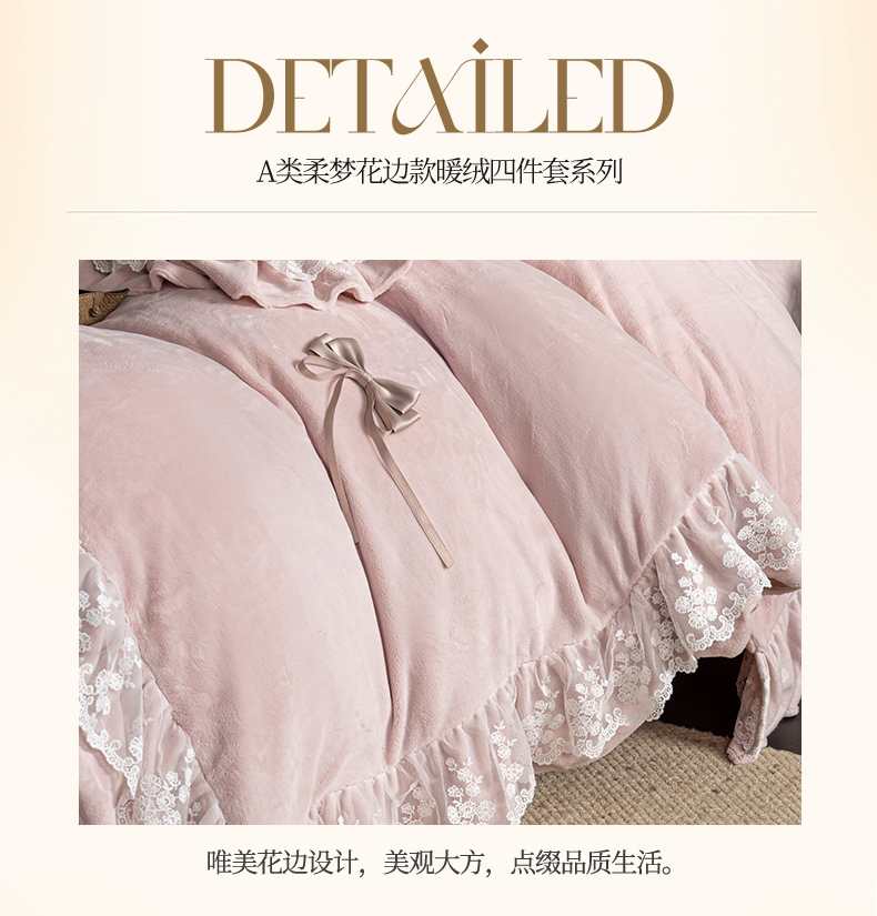 商品名称:罗优家纺 2025新款柔梦花边款暖绒四件套 甜梦粉