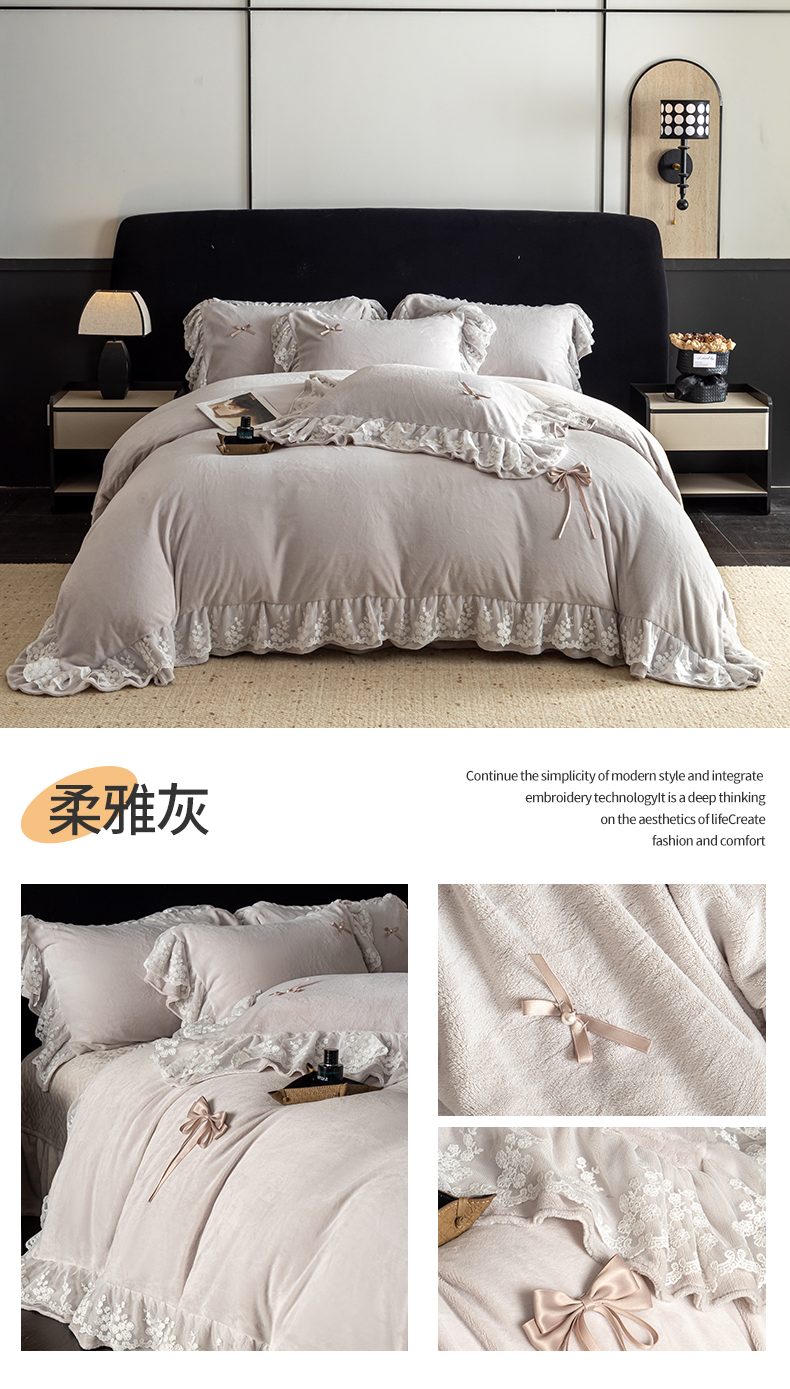 (总)罗优家纺 2025新款柔梦花边款暖绒四件套,暖杏色,柔雾蓝,柔雅灰,甜梦粉
