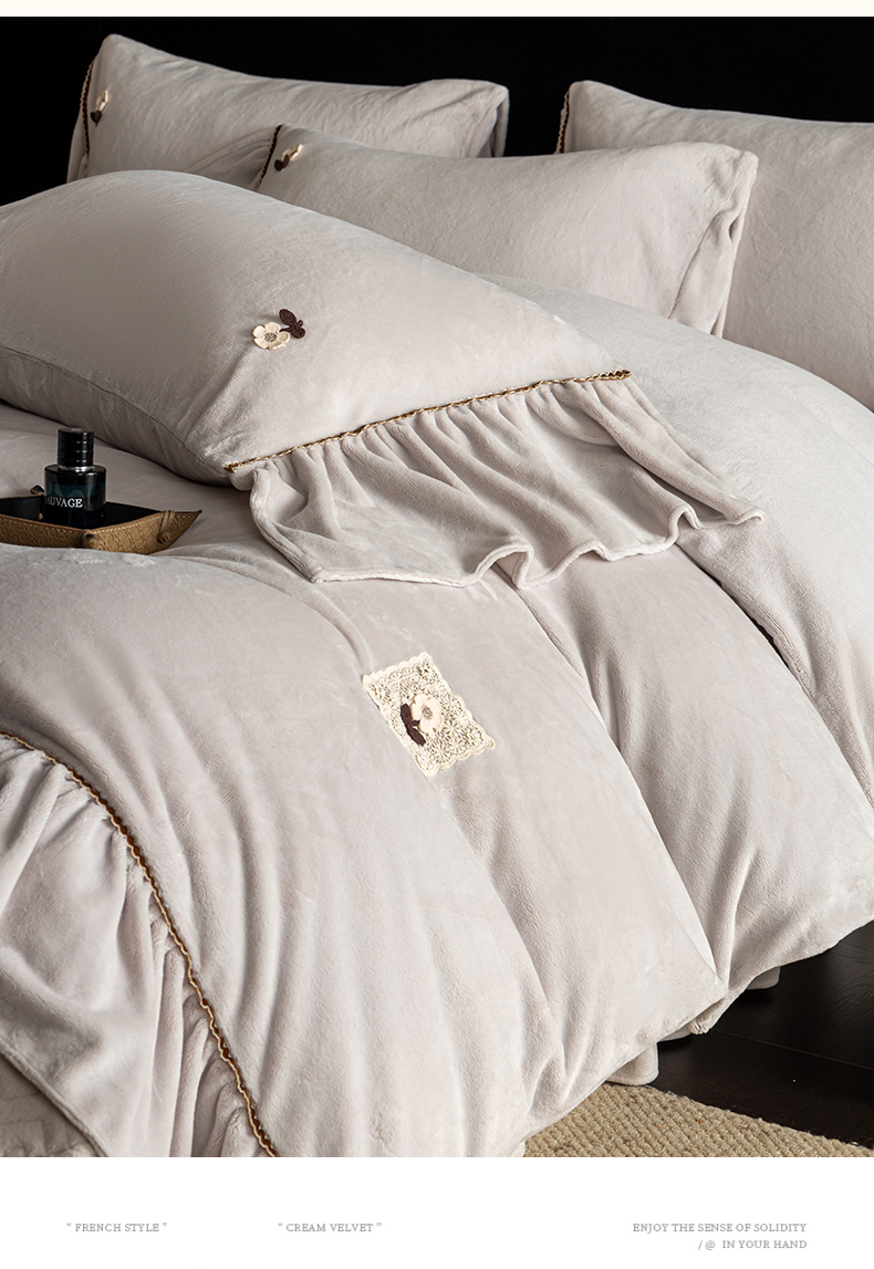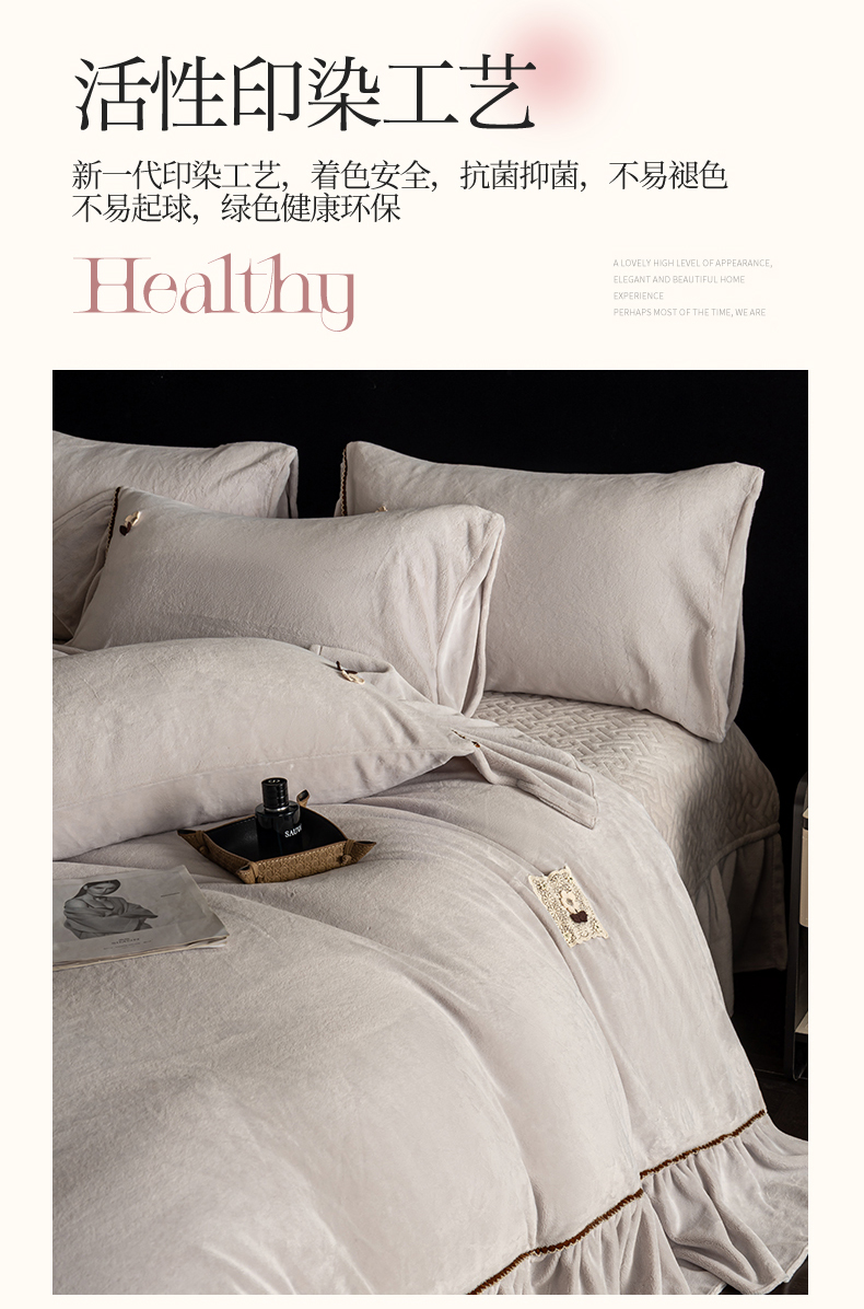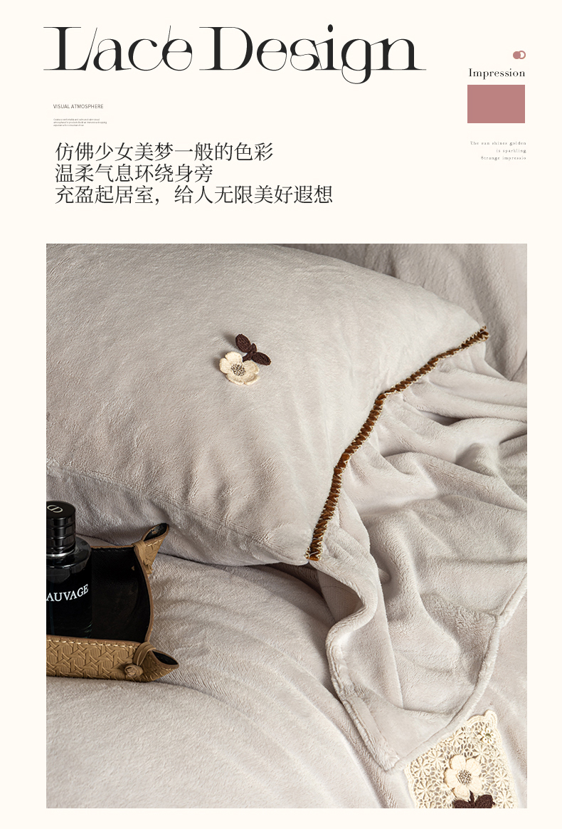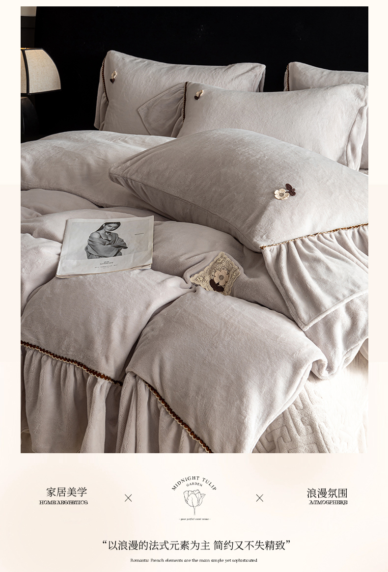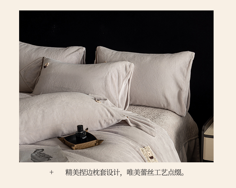 (总)罗优家纺 2025新款柔梦花边款暖绒四件套,暖杏色,柔雾蓝,柔雅灰,甜梦粉