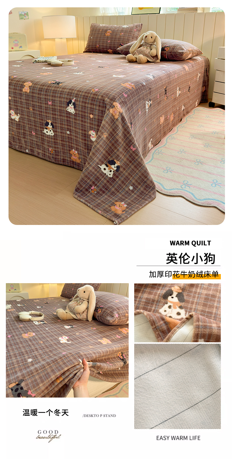 丽美人家纺 2025新款小版印花牛奶绒床单单床单床单单件 格子小狗
