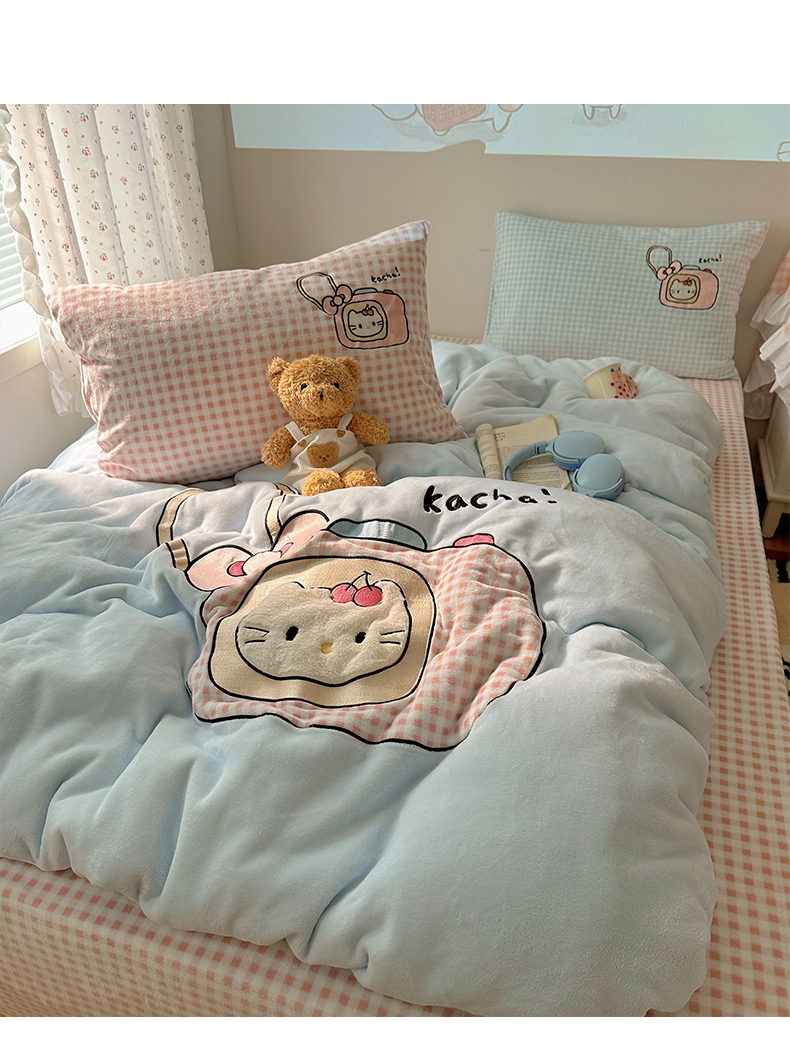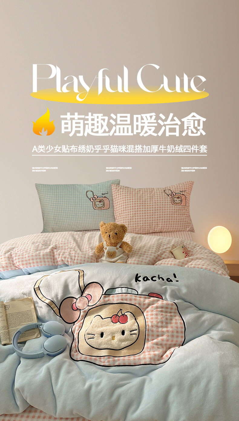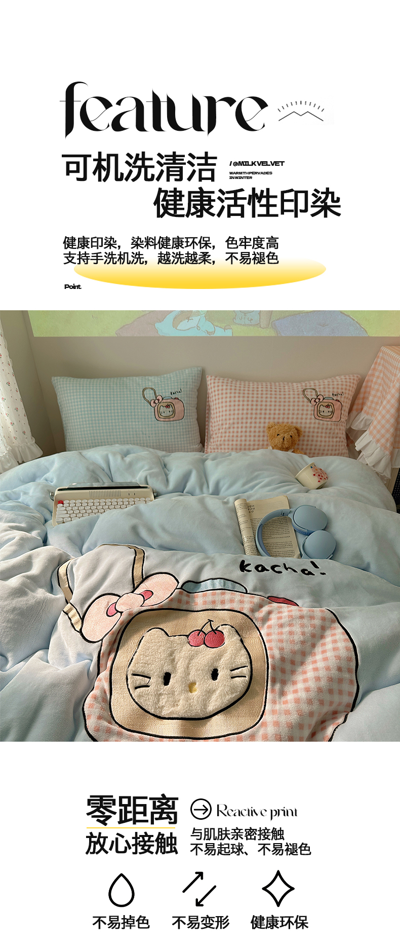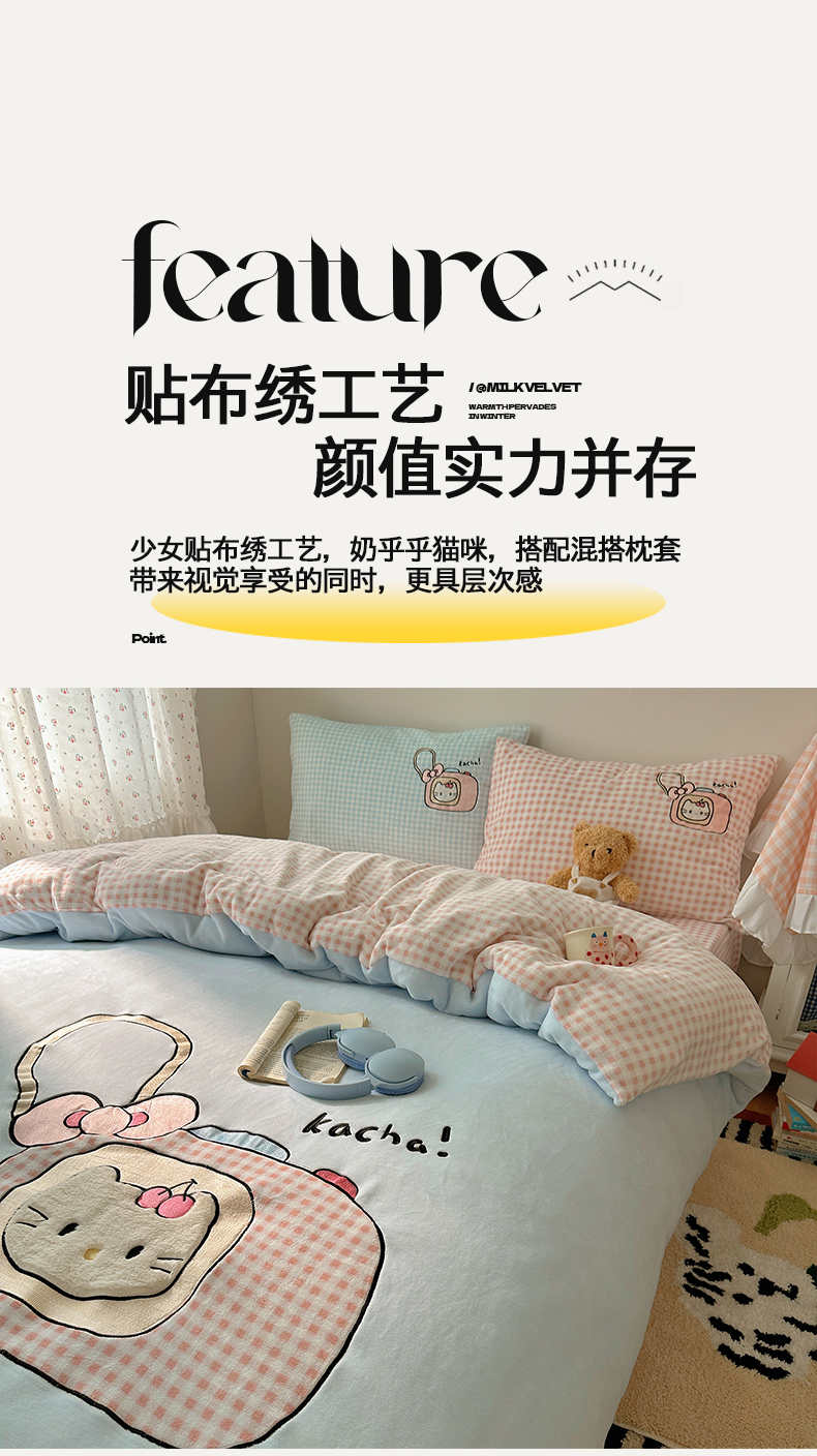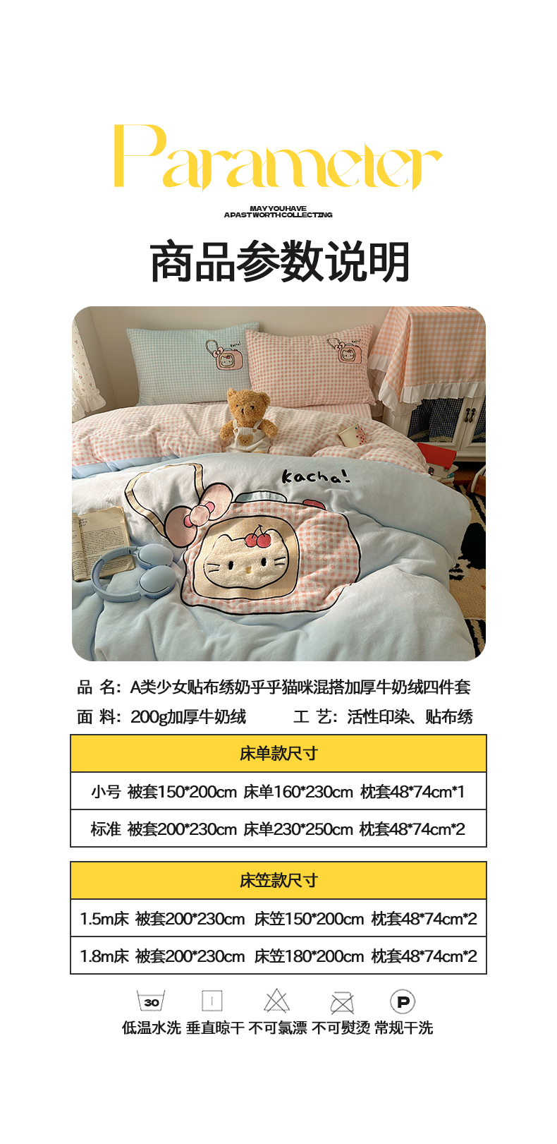 当前位置: 91家纺网 > 商品网购 > 床品套件 > 四件套 > 牛奶绒四件套 > 桃子家居 2025新款A类兔毛贴布绣刺绣牛奶绒四件套 绒贴布绣-蓝粉相机喵喵