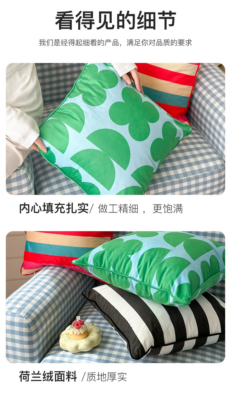 (总)美茉家居 2025新款荷兰绒丝绒炫彩糖果抱枕,彩虹条,橙方块,黑白条,绿四叶