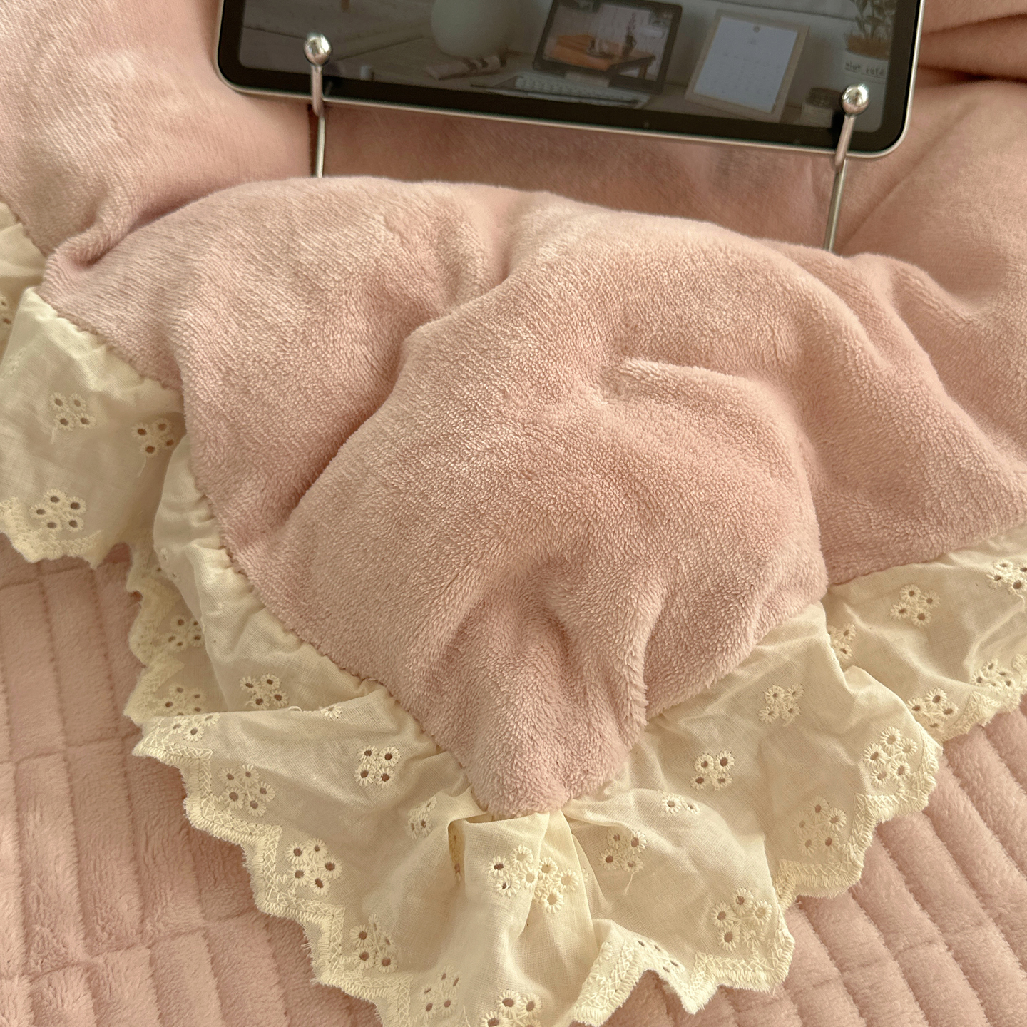 欧尚 2025新款牛奶绒花边床盖四件套 仙女粉