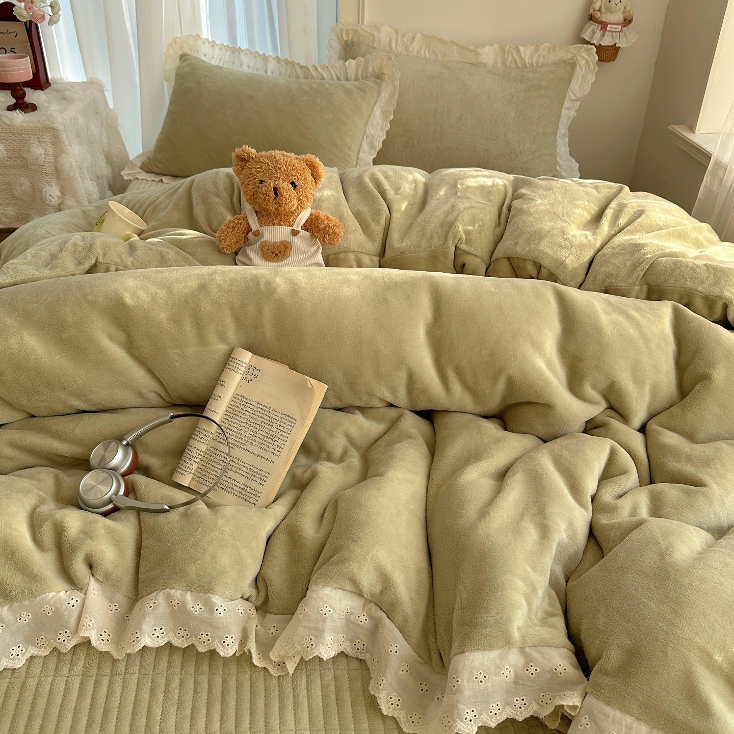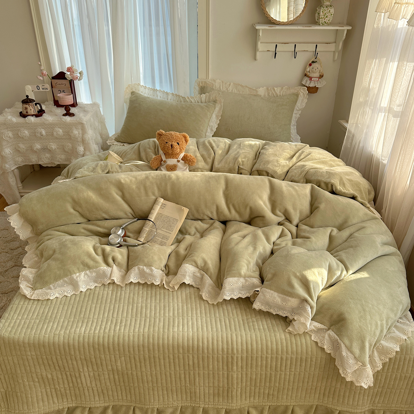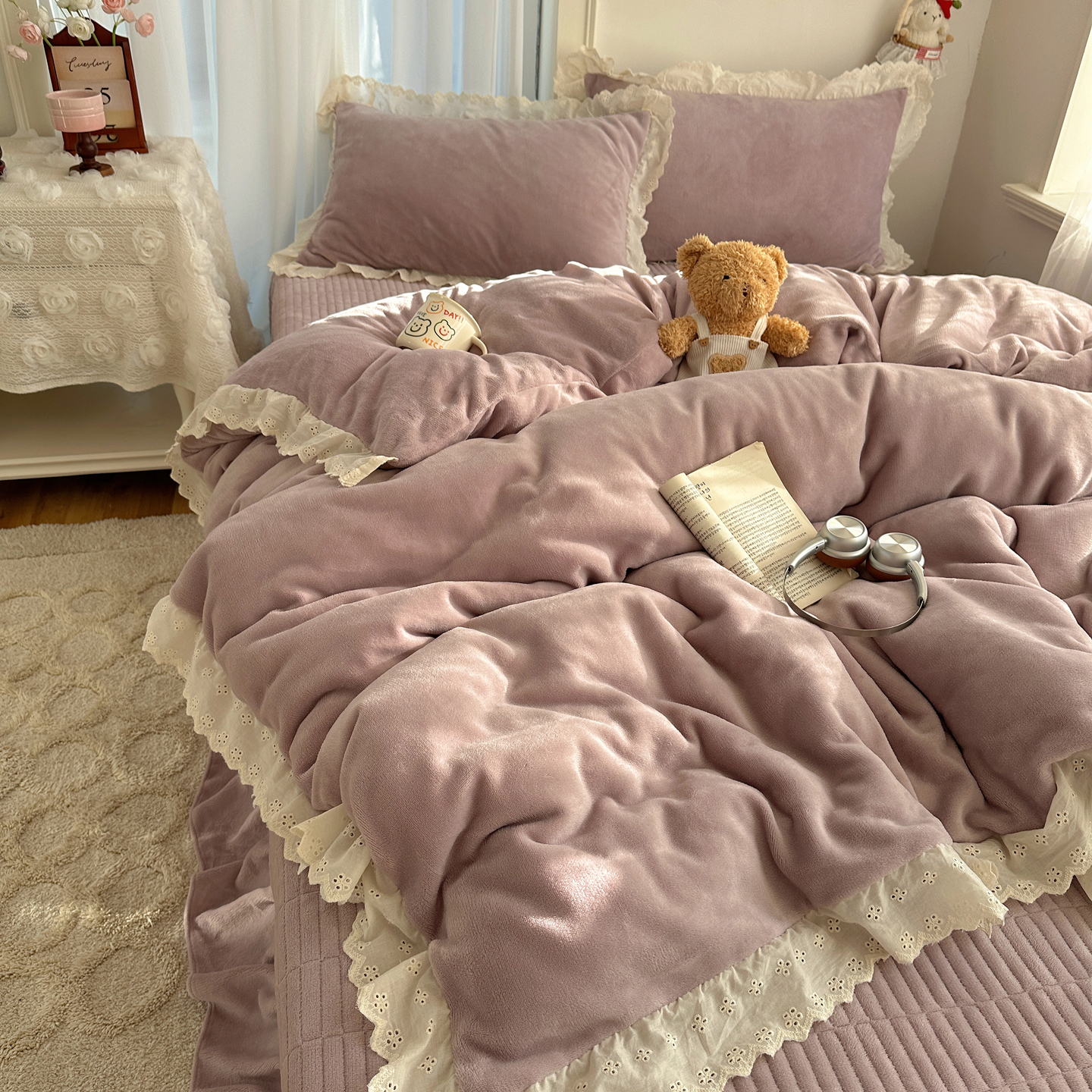 (总)欧尚 2025新款牛奶绒花边床盖四件套,粉点点,花小玉,咖色小心心,蓝点点,慕然,仙女粉,仙女紫