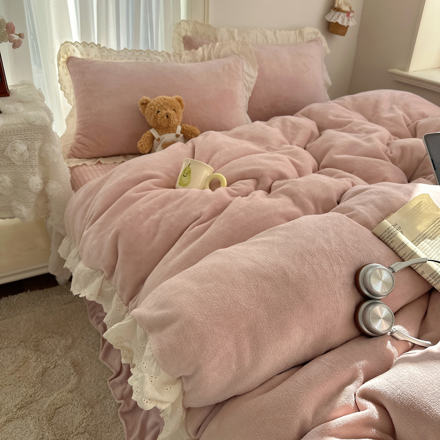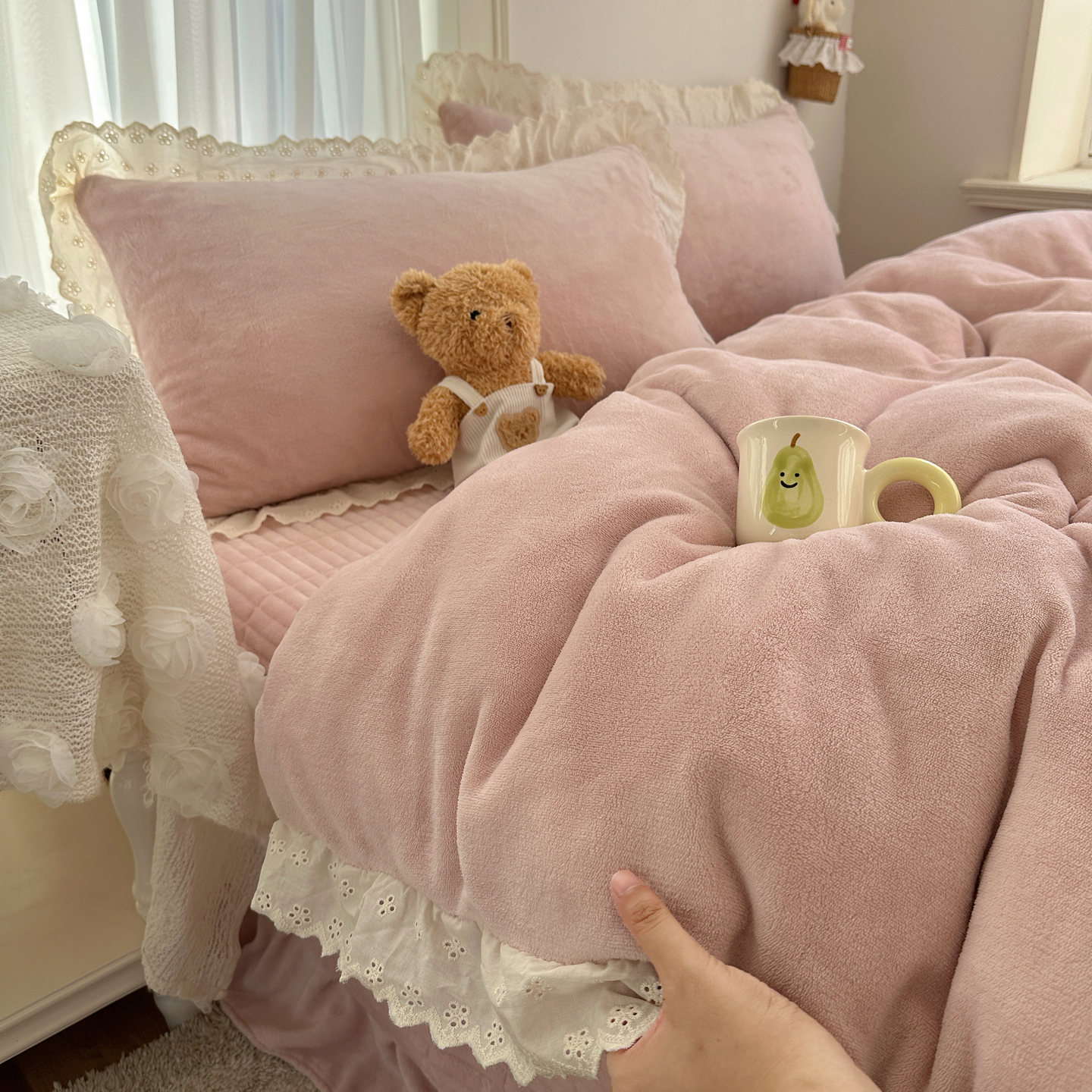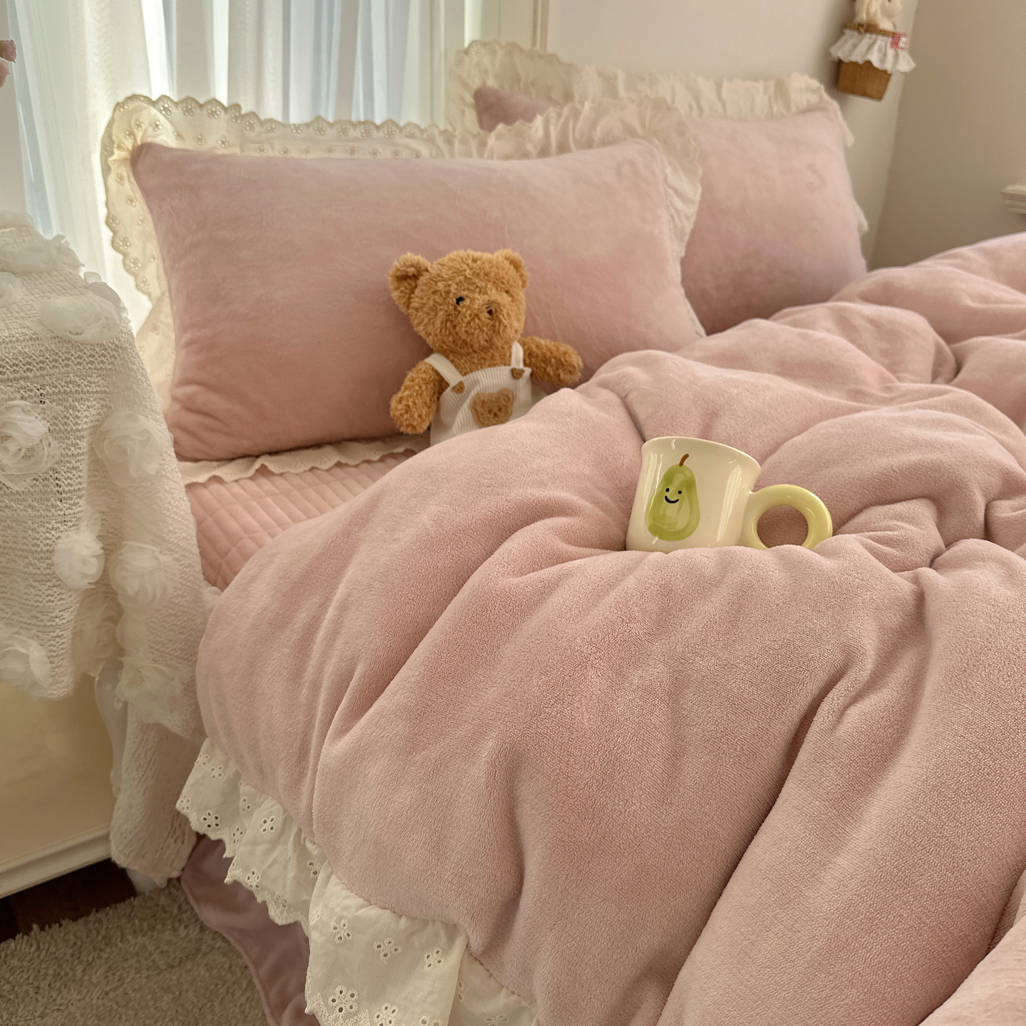 商品名称:欧尚 2025新款牛奶绒花边床盖四件套 仙女粉