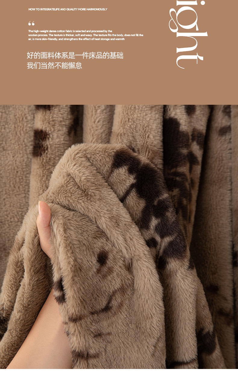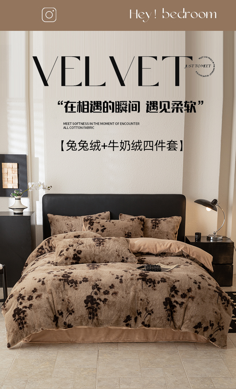 商品名称:简宜家居(朝初家纺) 2025新款印花兔兔绒+纯色牛奶绒双拼四件套 一支秀-咖