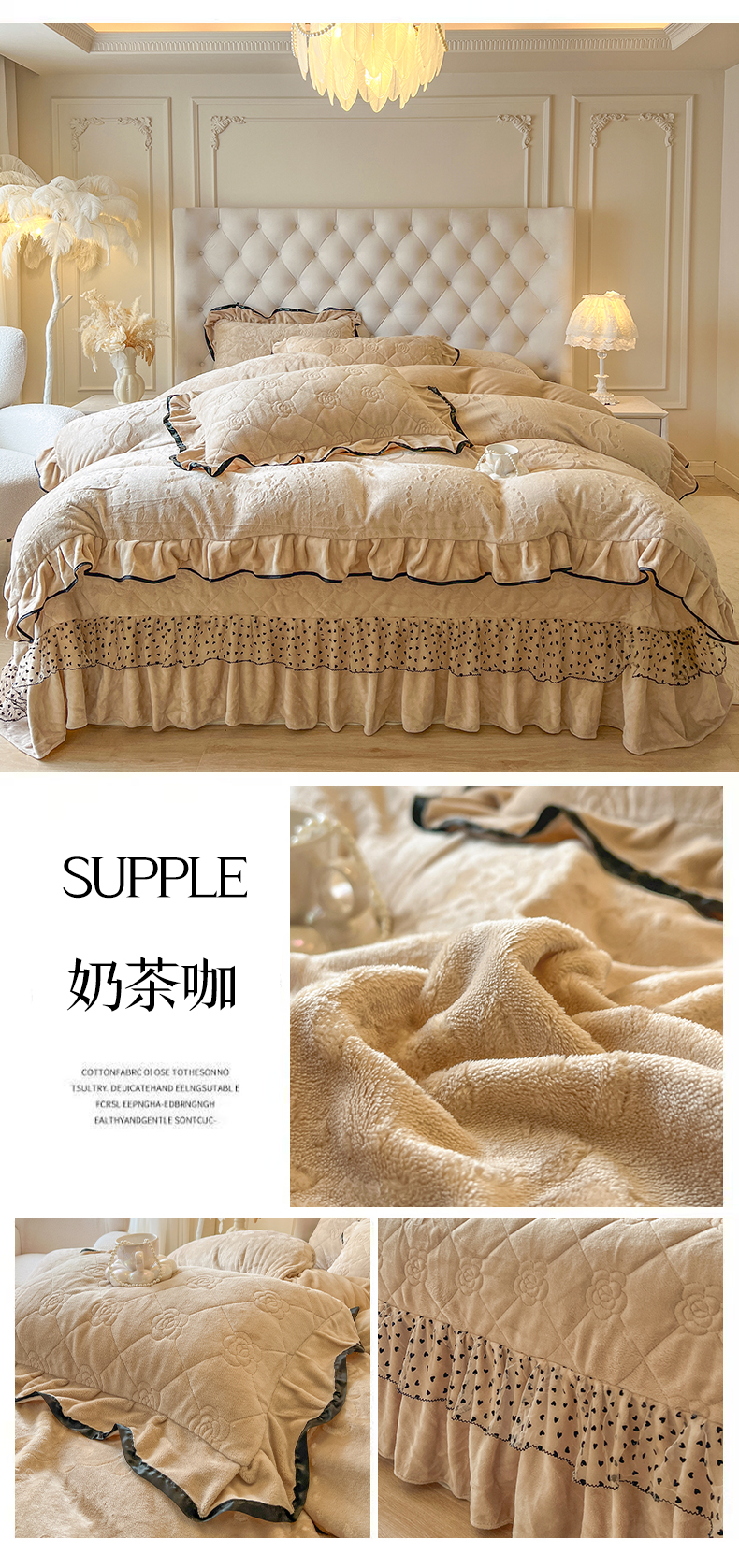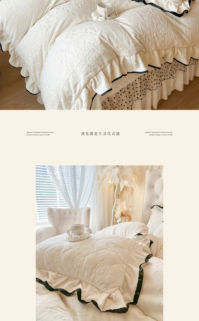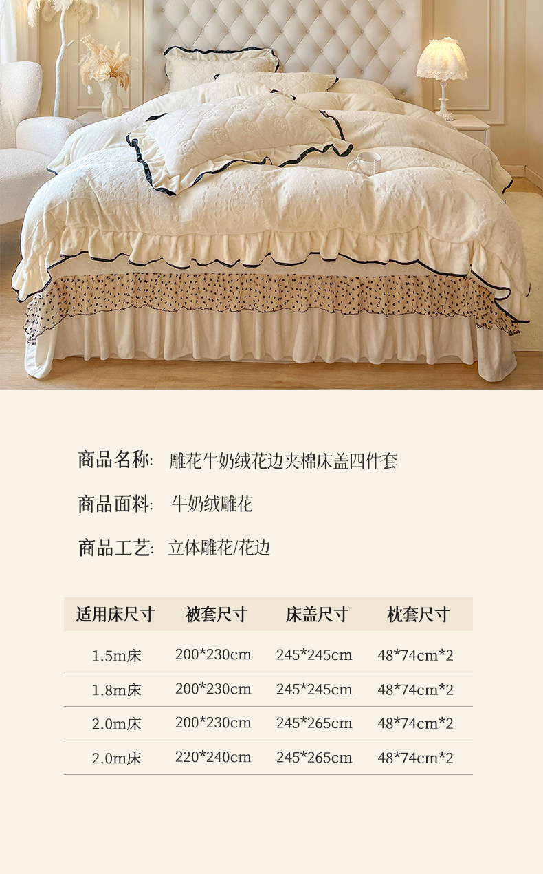商品名称:瑞宝 2025新款雕花牛奶绒花边夹棉床盖四件套-莫妮卡 奶茶咖