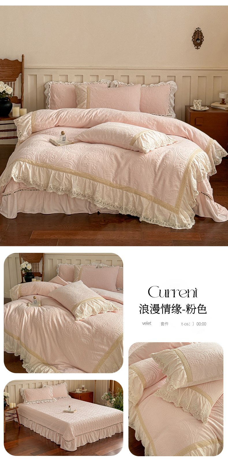 (总)花香四季家纺 2025新款雕花绒牛奶绒夹棉床盖款四件套系列-浪漫情缘,浪漫情缘-粉色,浪漫情缘-米白