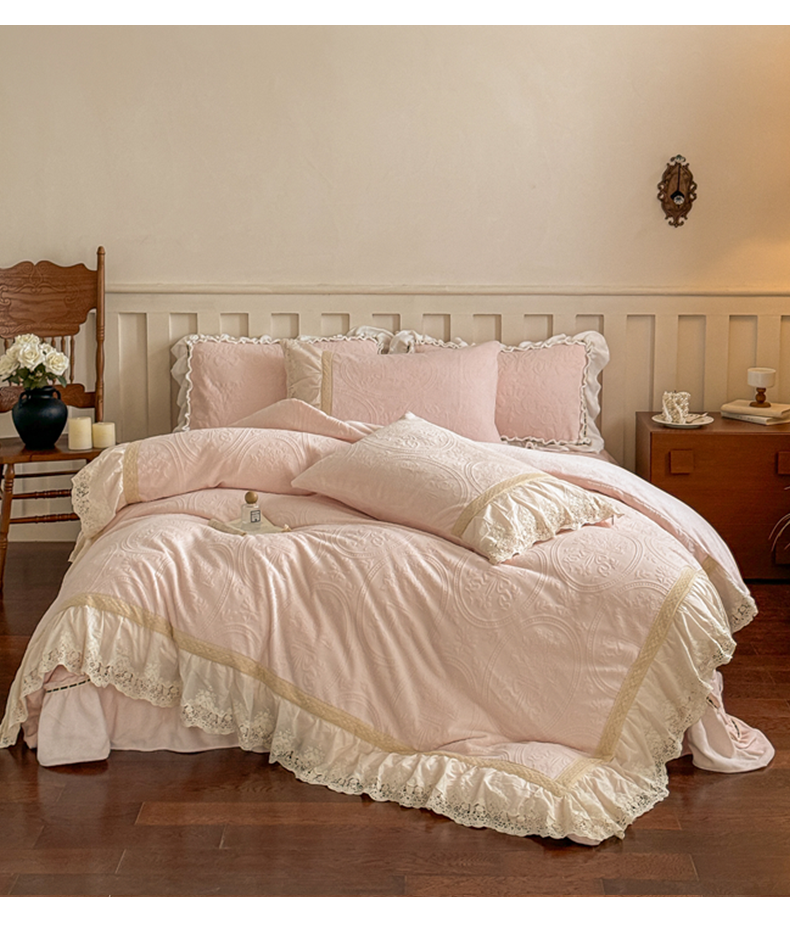 商品名称:花香四季家纺 2025新款雕花绒牛奶绒夹棉床盖款四件套系列-浪漫情缘 浪漫情缘-粉色
