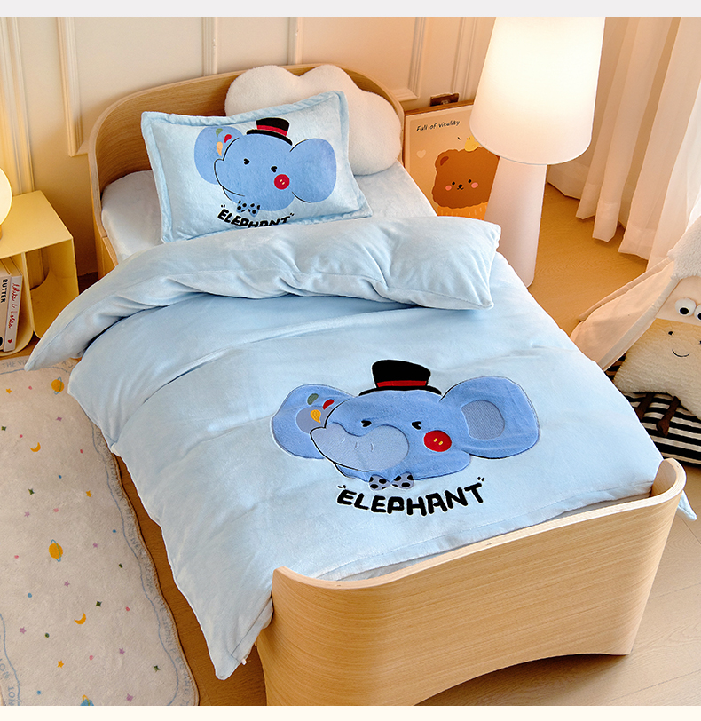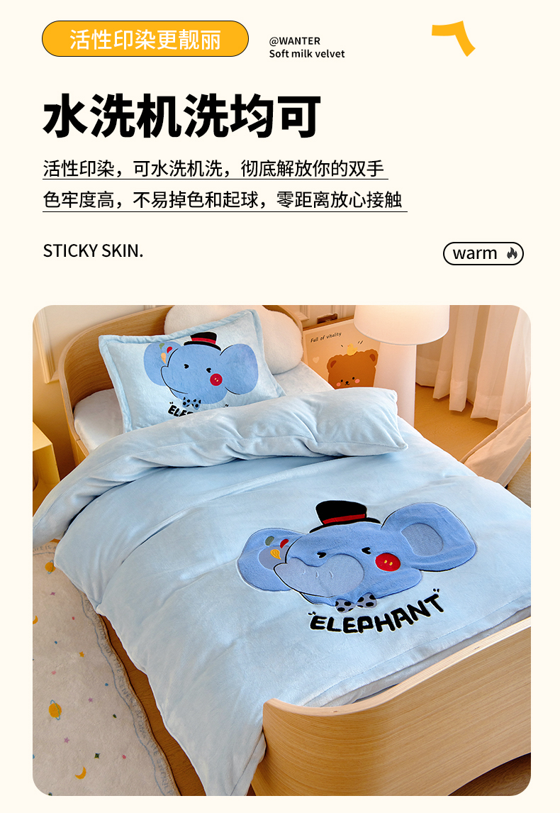 • 91家纺网 家纺一手货源 找家纺 (总)梵赫 2025新款加厚牛奶绒贴布绣原创卡通幼儿园套件儿童三件套,超级小萌怪,可爱小鸭,围巾兔,机灵小挖机,巧克力熊,组合,大象先生