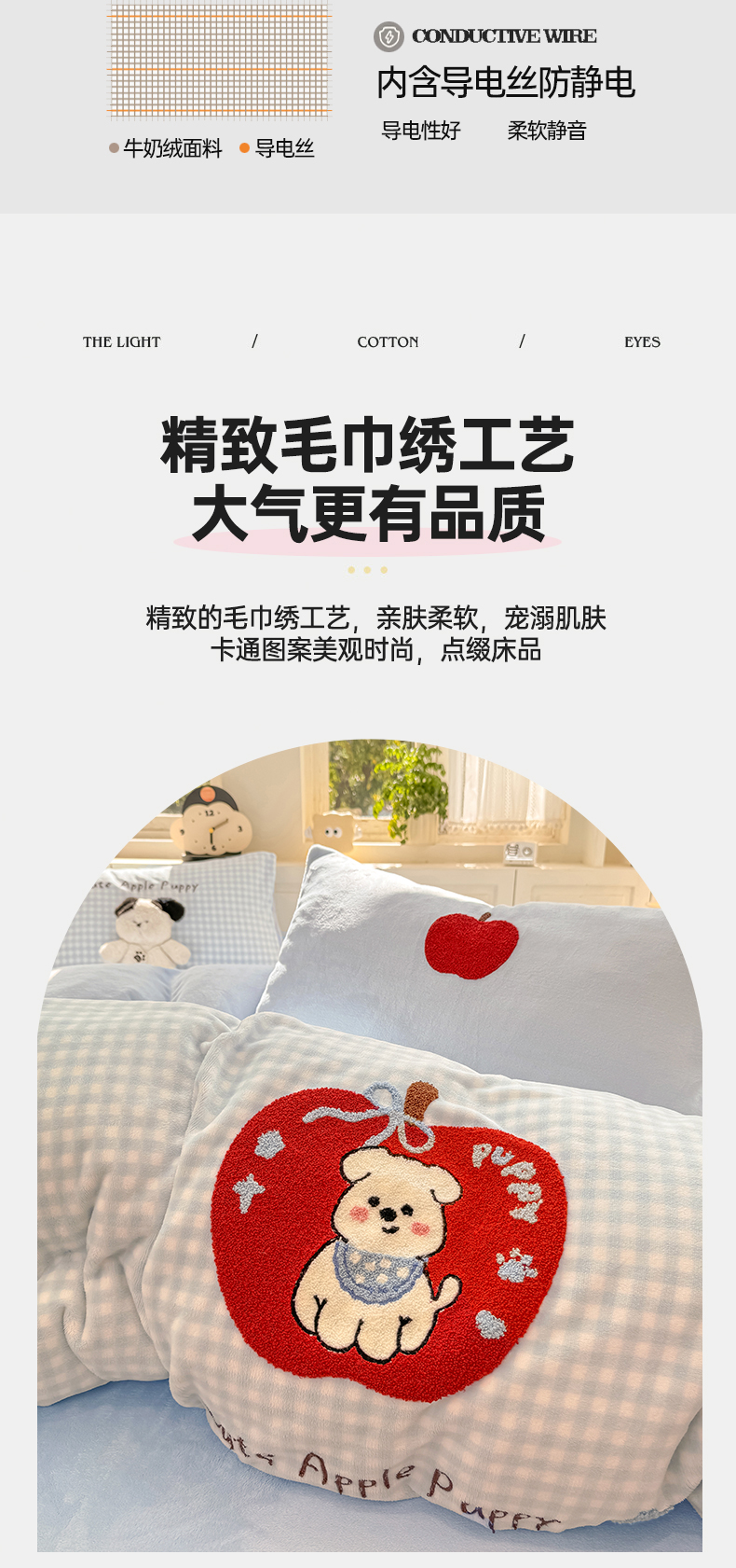 商品名称:(总)灰鲸 2025新款牛奶绒毛巾绣苹果狗、蛋糕喵系列四件套