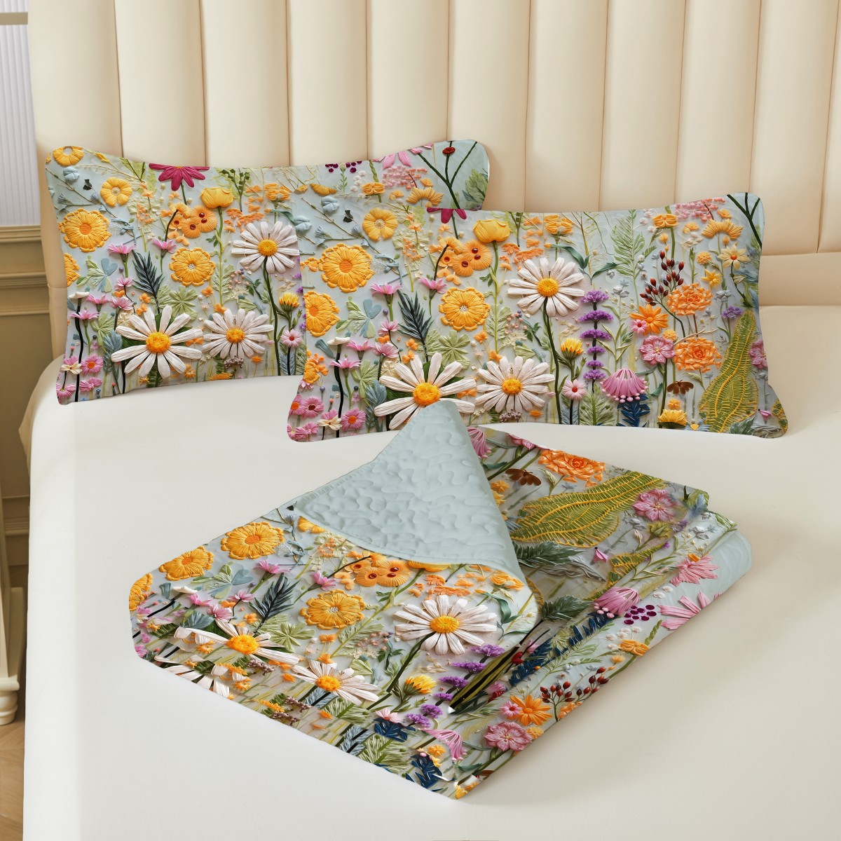 (总)跨境专供 2025新款化纤压花绗缝被可水洗床盖三件套,蒙特压花