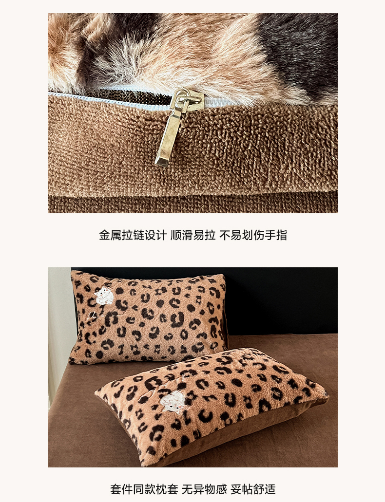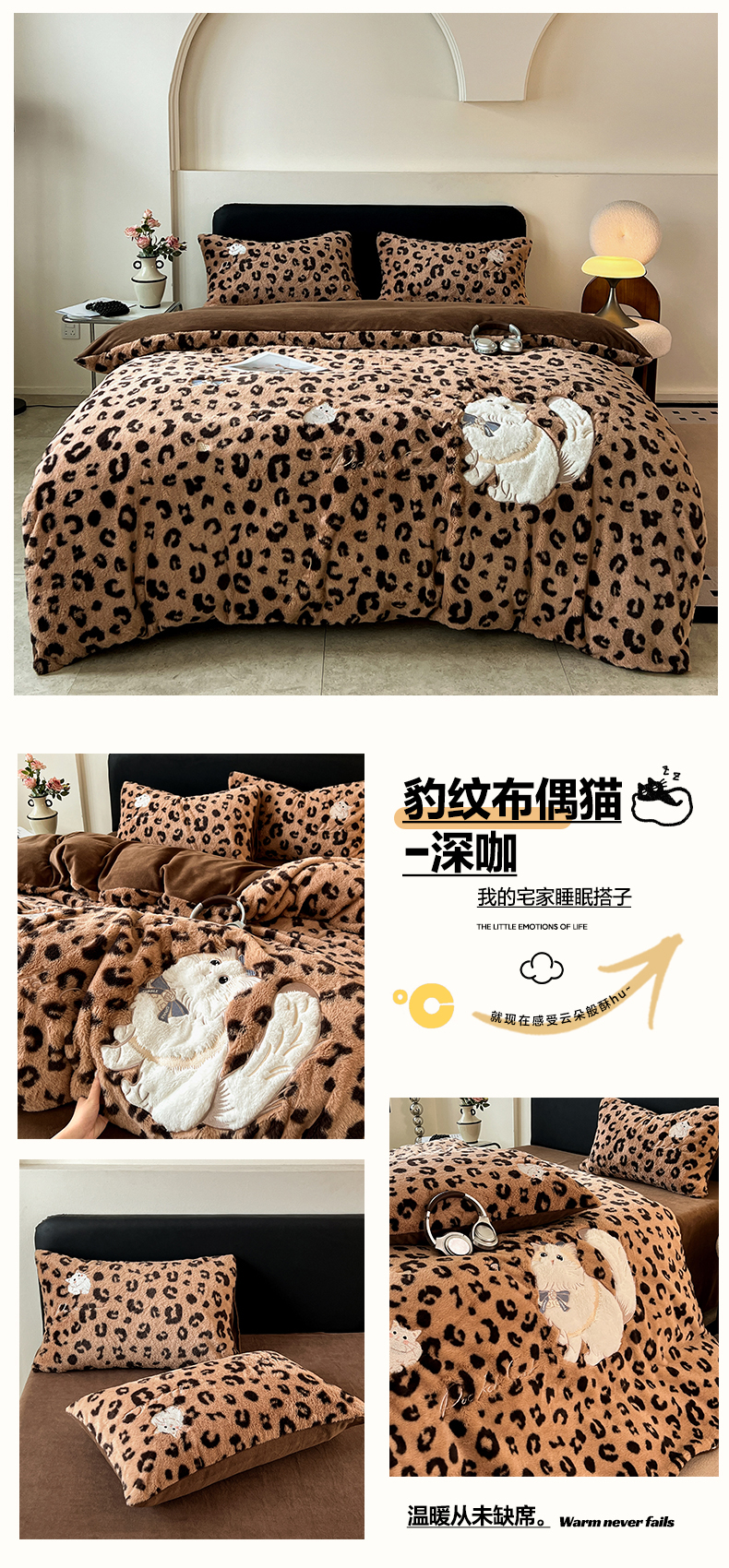梵克保罗 2025秋冬新款兔毛绒豹纹印花绣花款牛奶绒四件套 豹纹布偶猫-浅灰