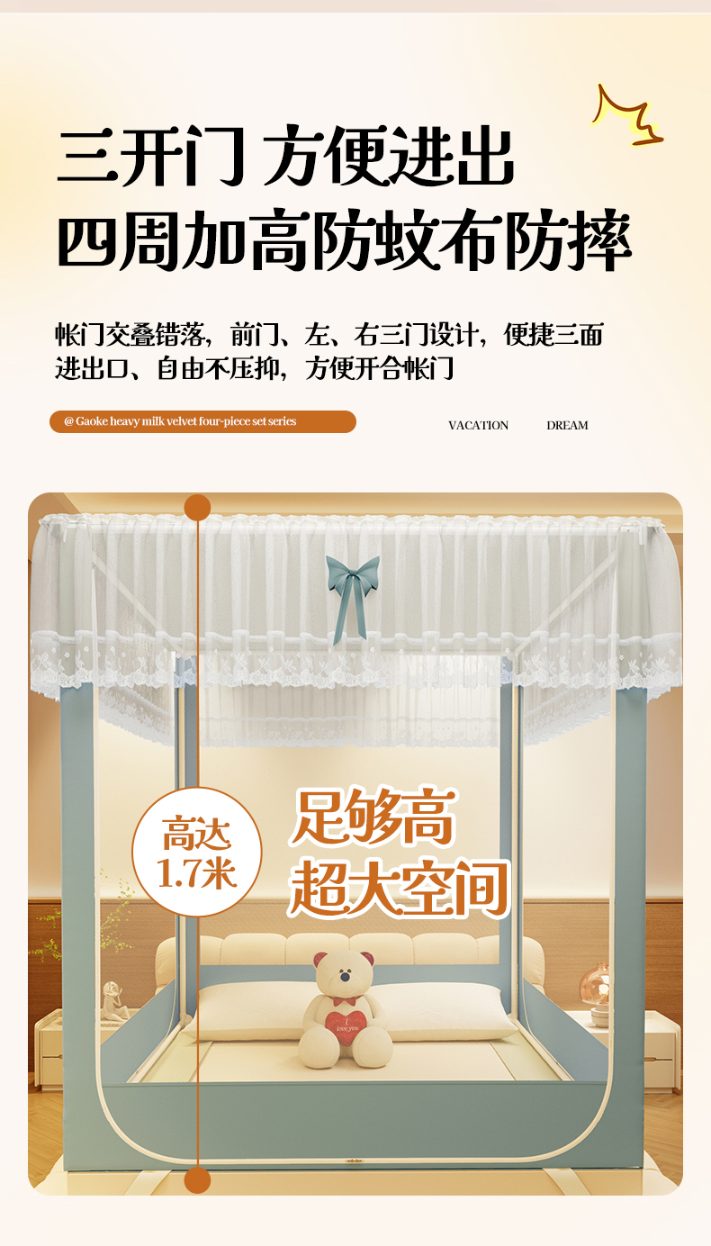 • 91家纺网 家纺一手货源 找家纺 (总)夏彩 2025新款五面保暖亲肤面料坐床拉链四季款蚊帐-88632,星愿熊,拉贝贝,羽飞舞,支架,保暖顶-灰色,保暖顶-粉色,保暖顶-绿色