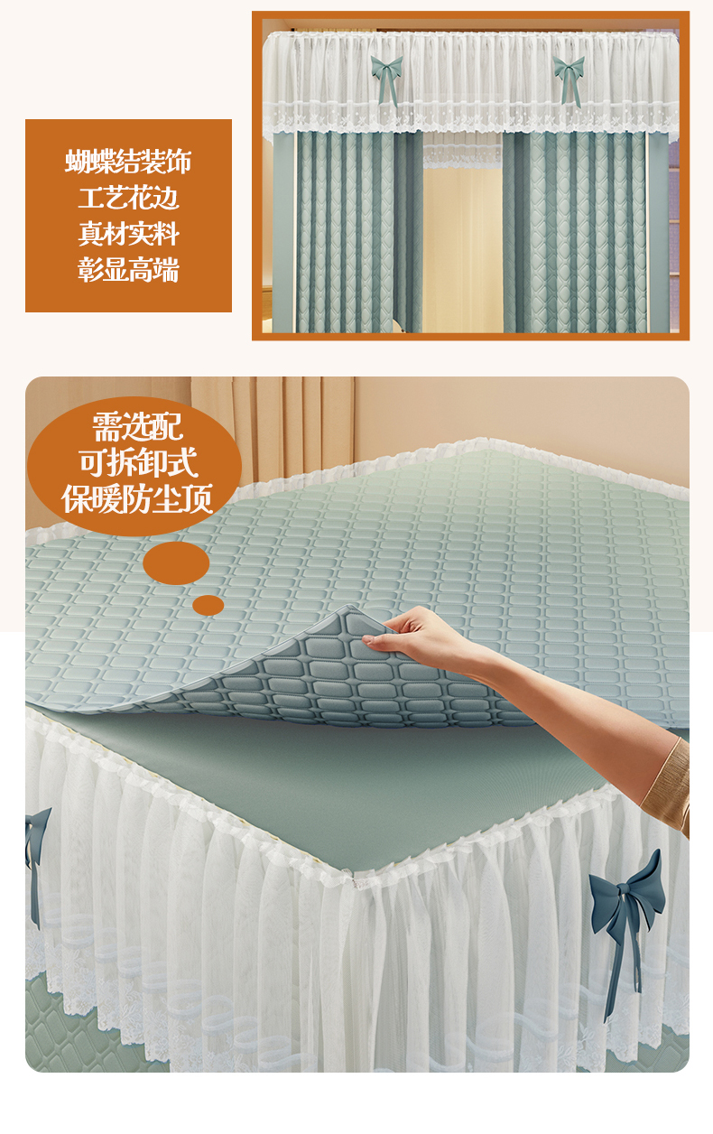 • 91家纺网 家纺一手货源 找家纺 (总)夏彩 2025新款蕾丝U型防摔坐床蚊帐-88630,绿雅灰,藕玉色,香槟色
