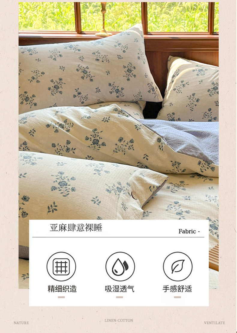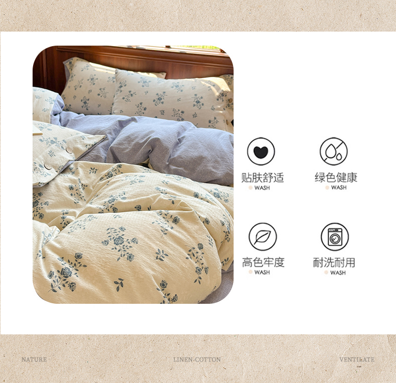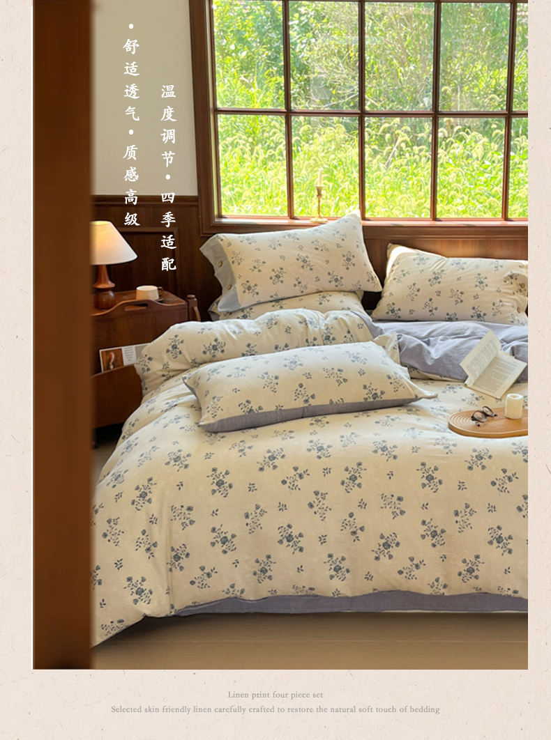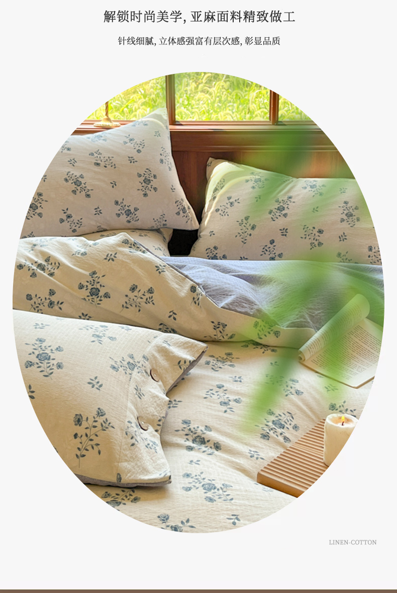 当前位置: 91家纺网 > 商品网购 > 床品套件 > 四件套 > 其它四件套 > 爱彼家纺 2025四季款亲水洗麻亚麻皱皱纱四件套-纽扣款-提供买家秀 花语兰