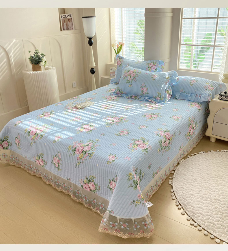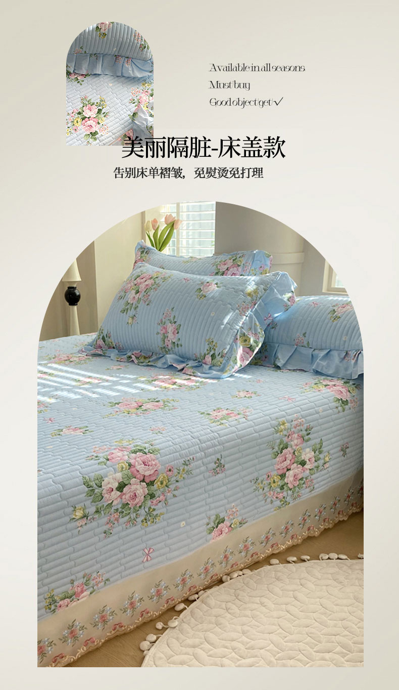 乐逸家纺 2025新款100%纯棉全棉印花 法式风情蕾丝花边床盖款 全棉夹棉绗缝蕾丝款床盖-柔风铃兰花瓣