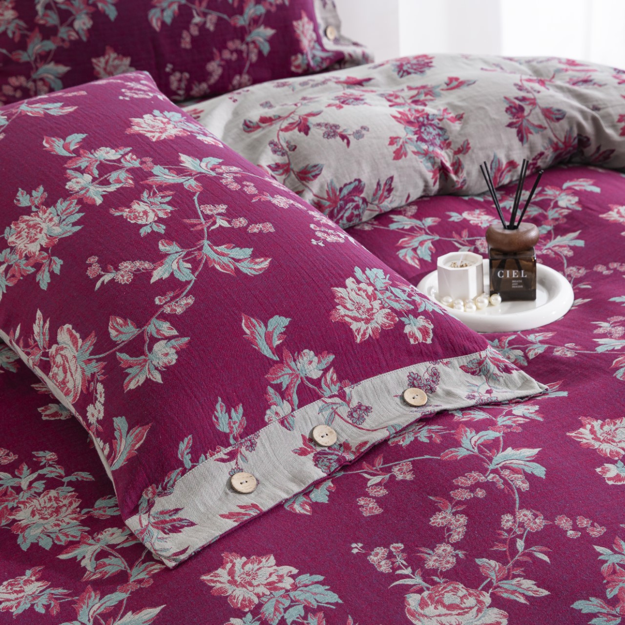 商品名称:(总)仰望棉麻双层纱供应链 2026新款浓清爱意全棉纯棉色织提花纽扣款四件套