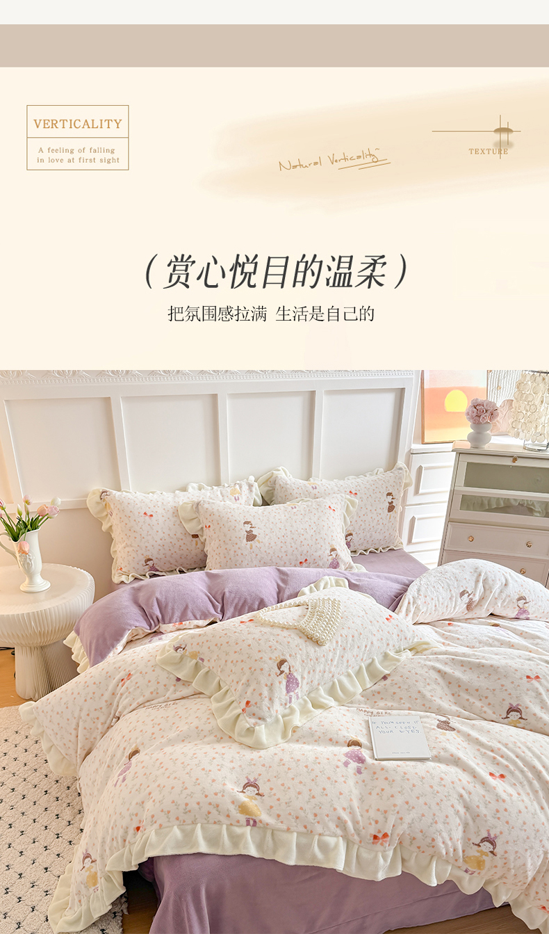 温眠家纺 2025新款200g全工艺牛奶绒花边款四件套吊边床单 春意