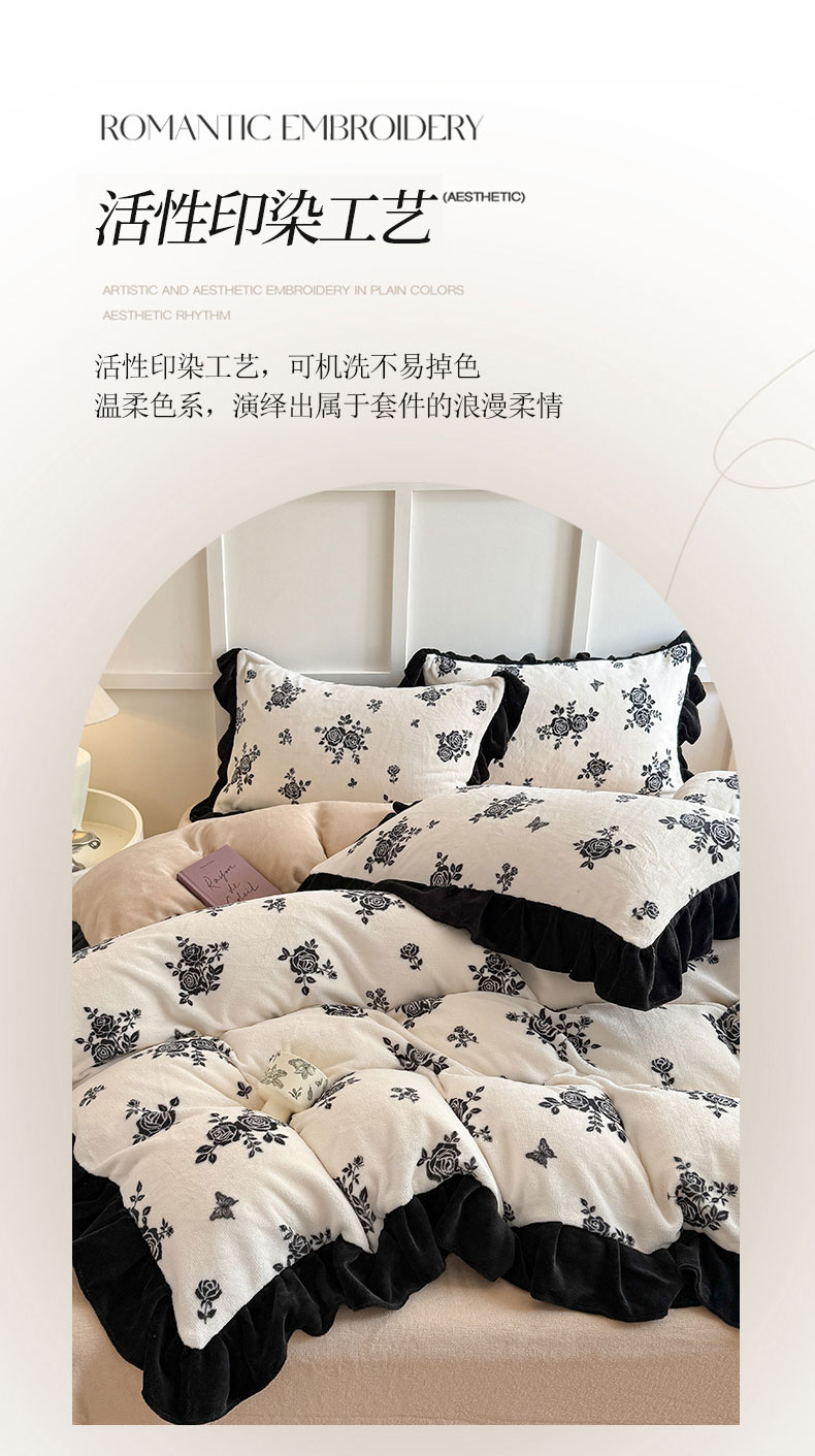 商品名称:温眠家纺 2025新款200g全工艺牛奶绒花边款四件套吊边床单 山野玫瑰