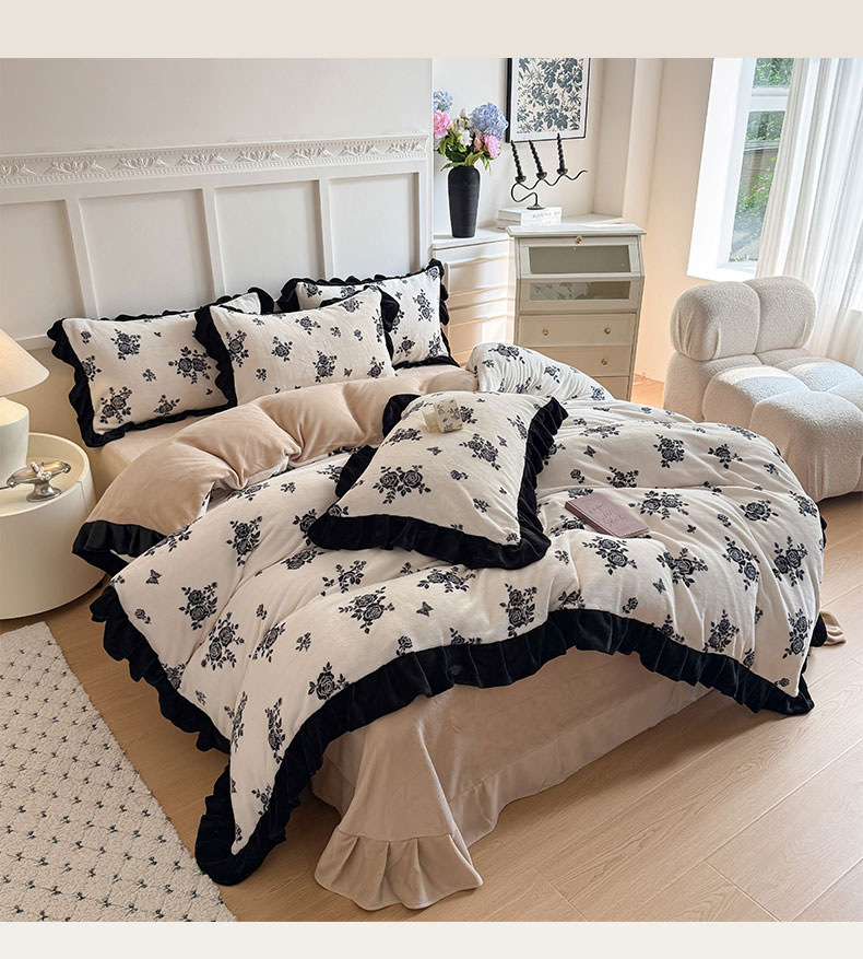 温眠家纺 2025新款200g全工艺牛奶绒花边款四件套吊边床单 山野玫瑰