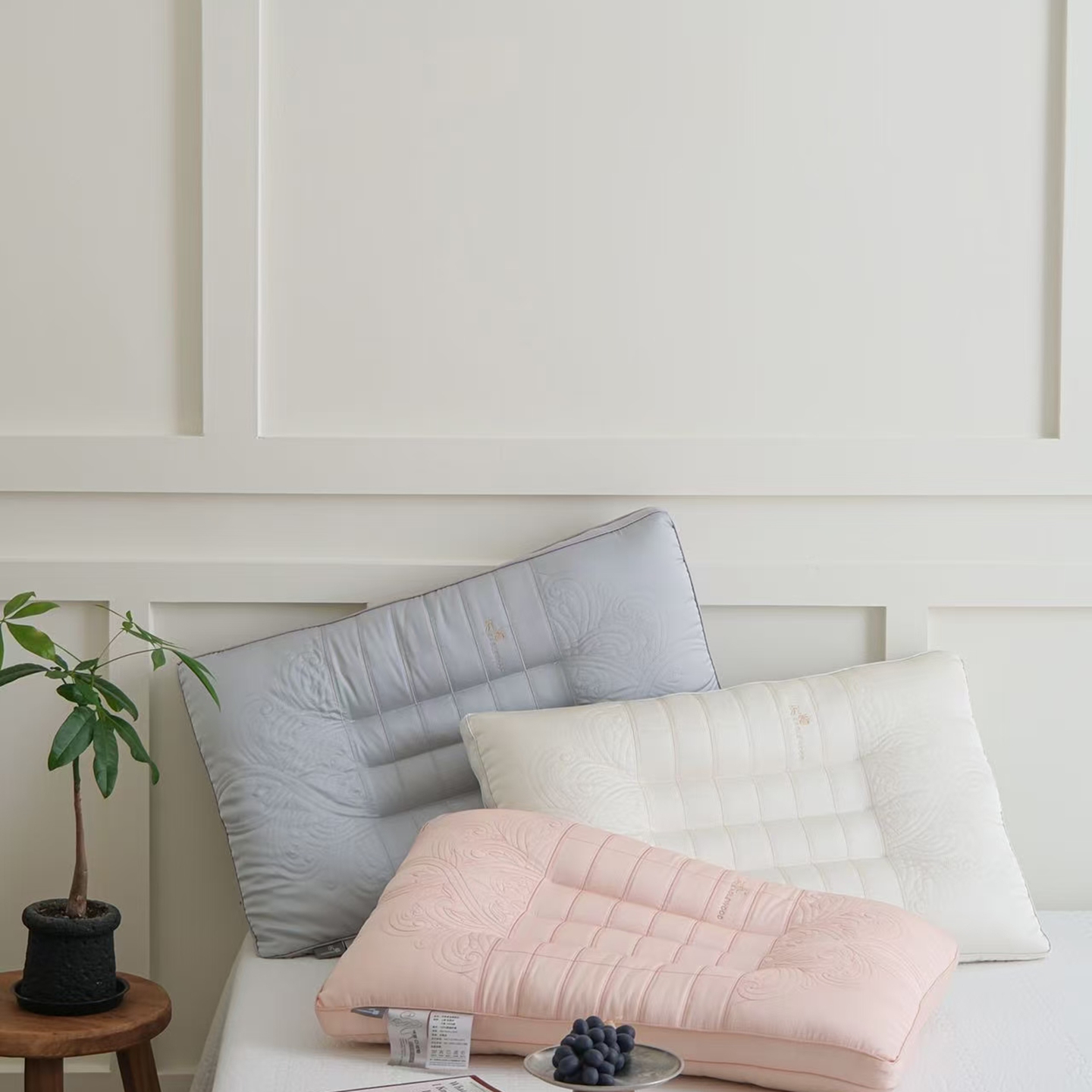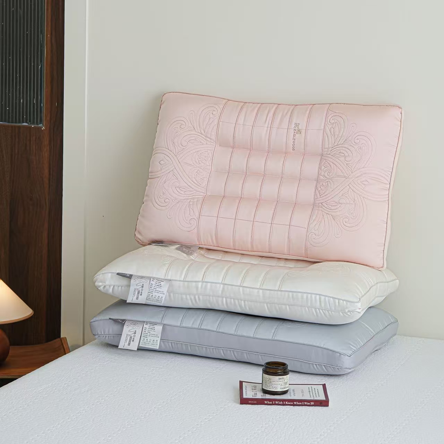 (总)夏冬家纺 2026新款沉香刺绣枕,白,灰,粉