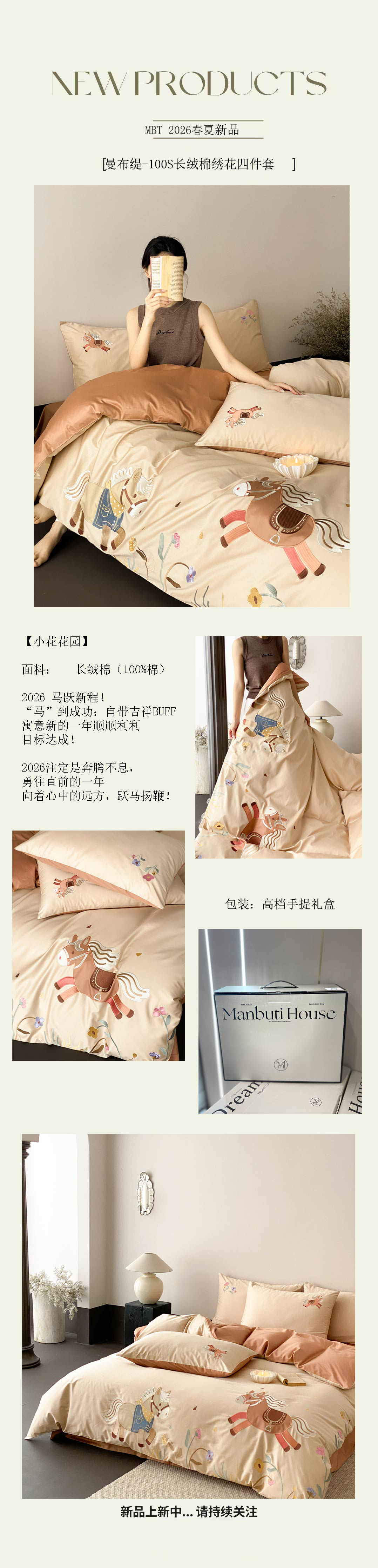 (总)曼布缇 2026春夏新品100S长绒棉绣花新品四件套-小马花园 会员减20【券后严格按照控价378起,小号券后348起】