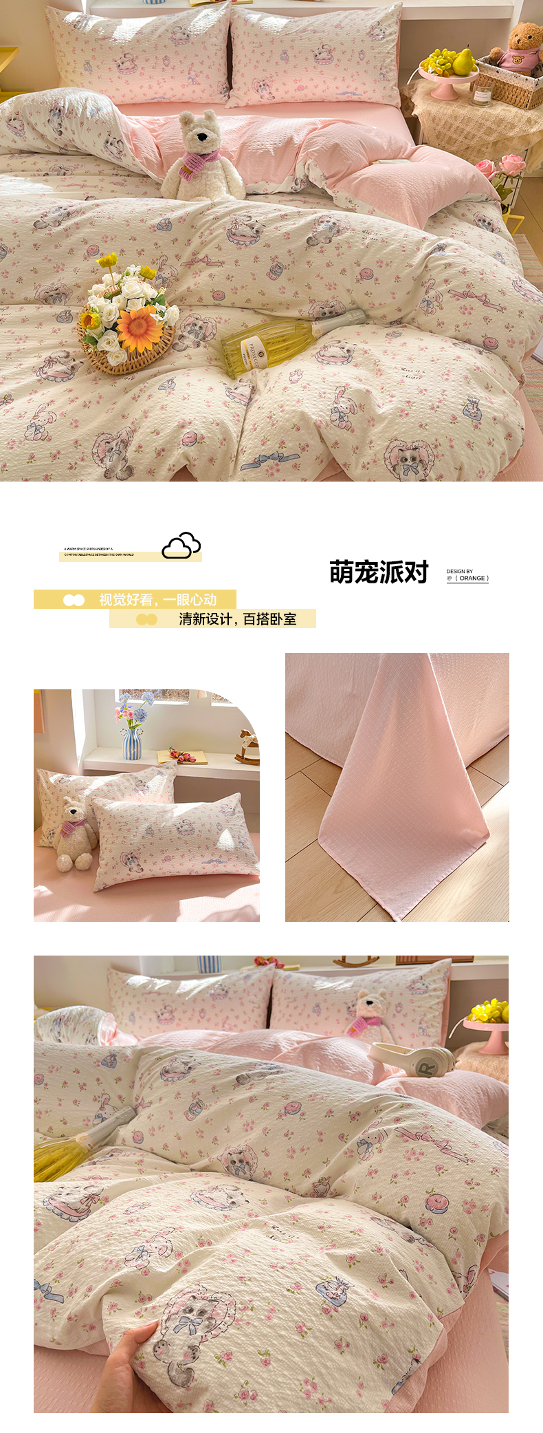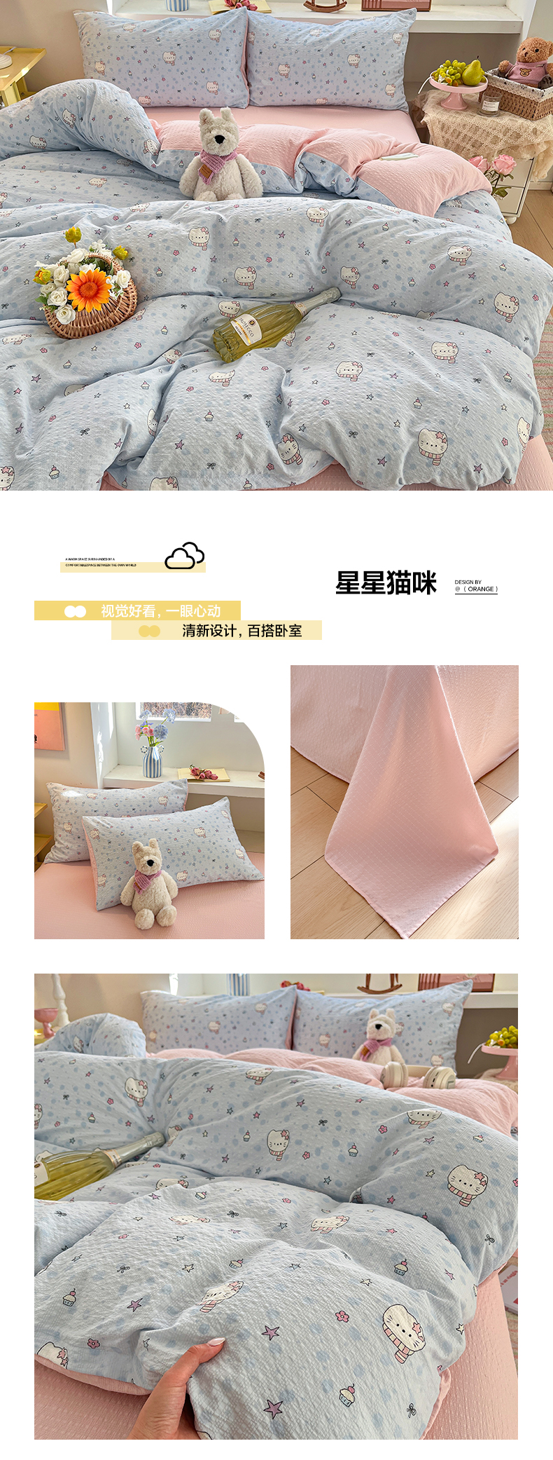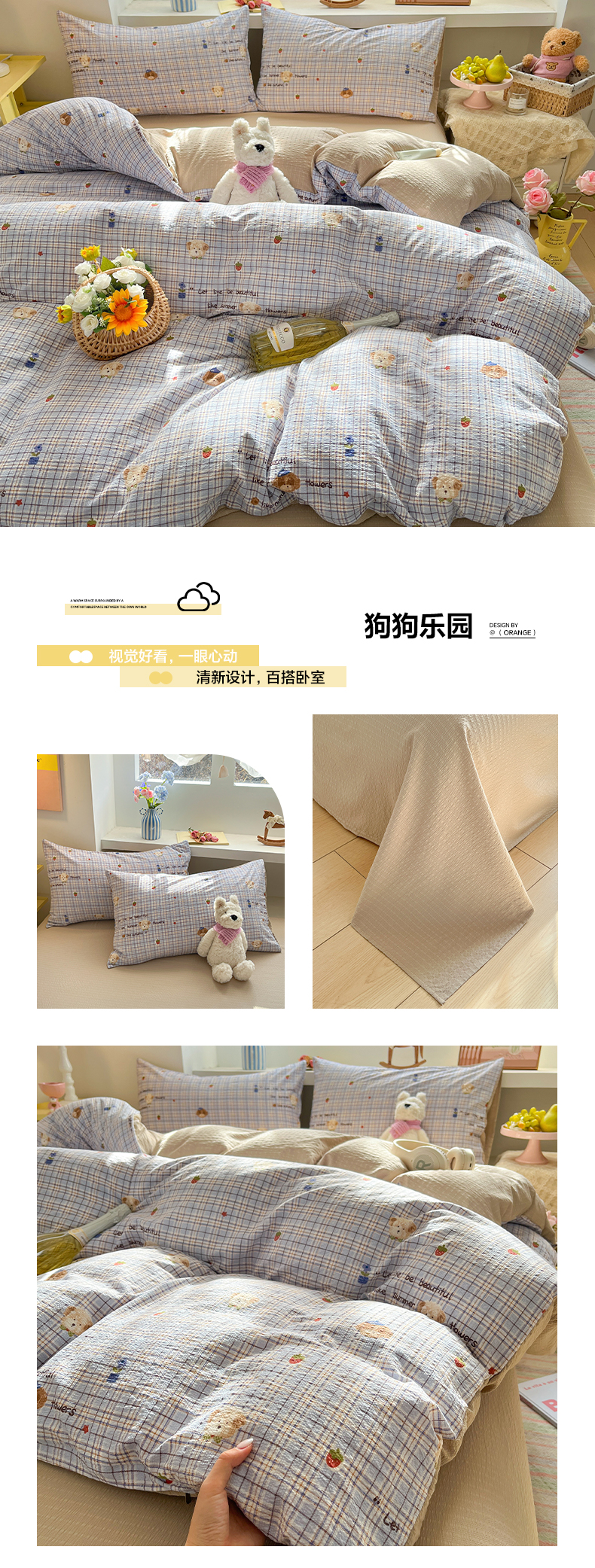 (总)卡迪熊家纺 2025新款水洗双层纱双拼碎花四件套,爱心蝴蝶结,彩色波点,多彩心情,分格棋盘,格纹猫咪,黑色波点,花园兔子,欢乐聚会,欢乐小狗,可爱猫猫,腊肠狗狗,满满花海,美好心情,藤条花蔓,甜点小屋,甜甜小兔,甜心猫咪,晚安世界,小花朵朵,小小樱桃