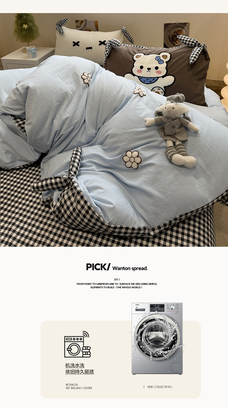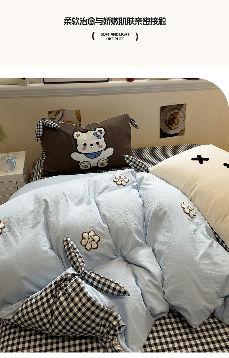 (总)盼季家纺 2026新款水洗棉毛巾绣毛球四件套,毛巾绣-奶油蓝格汪汪,毛巾绣-粉格哈尼兔,毛巾绣-麦小劳,毛巾绣-巧克力汪汪,毛巾绣-芝士猫咪酱