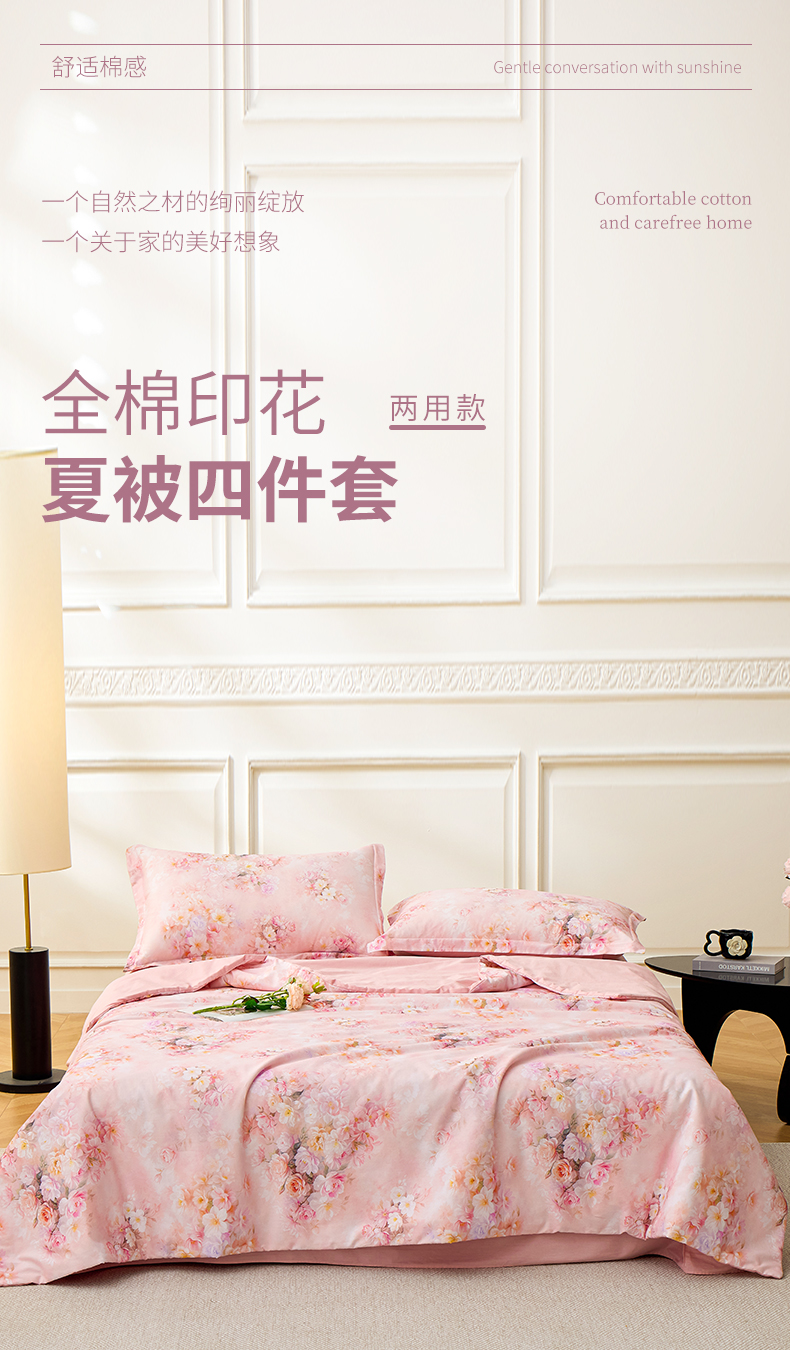 元元家居(元元被业) 2026新款全棉纯棉13372印花两用夏被夏凉被空调被四件套 乐园粉