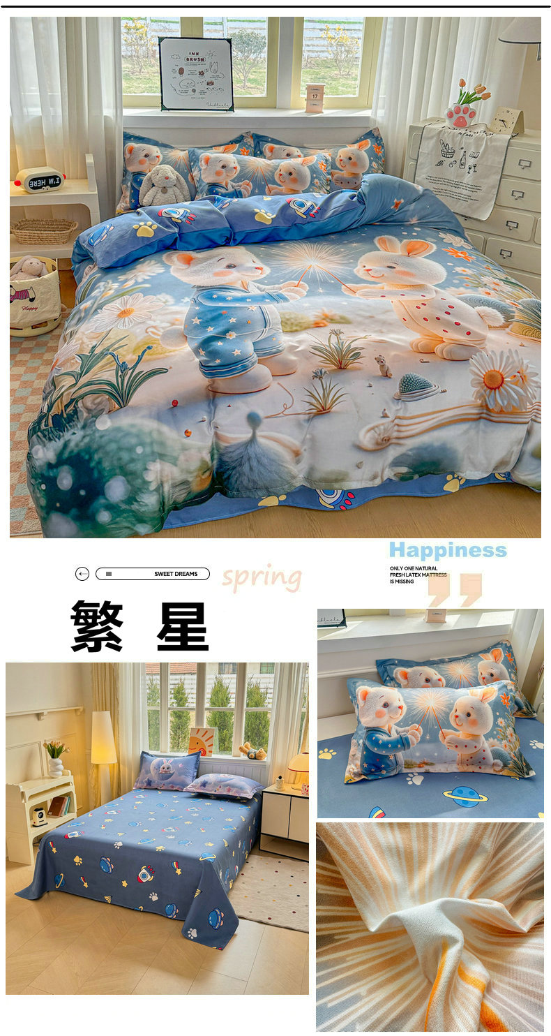 当前位置: 91家纺网 > 商品网购 > 床品套件 > 四件套 > 普通磨毛四件套 > 宝薇 2026春夏新款7D卡通加厚斜纹仿棉生态磨毛大版四件套 梨花开
