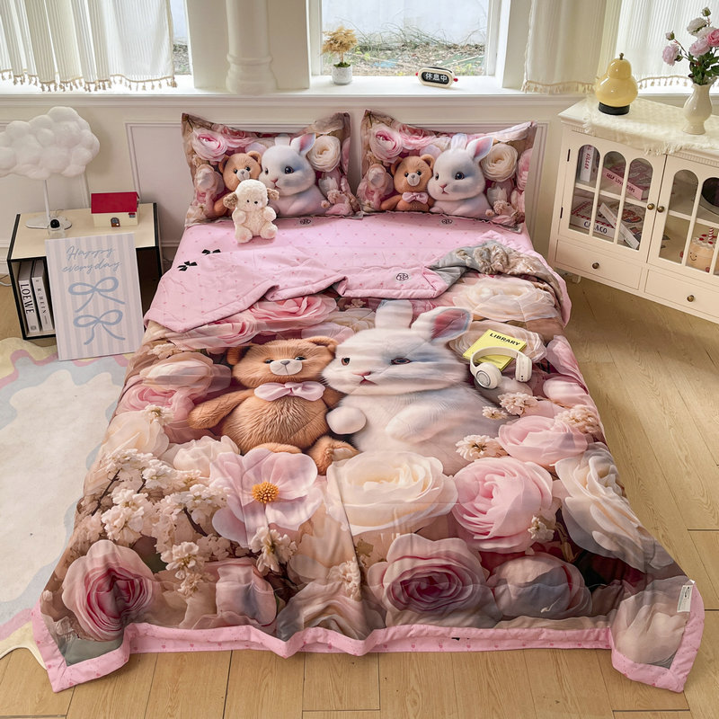 (总)宝薇 2026春夏新款7D卡通仿棉磨毛水洗棉夏被夏凉被空调被四件套,大白兔,繁星,好运松鼠,欢乐时光,梨花开,玫瑰兔,萌萌熊,牵手熊,太空人,天使兔,甜心兔,月亮兔