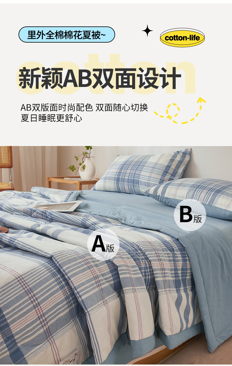 西域种棉人·千百笠 2026新款A类里外全棉夏凉被100%新疆棉纯棉全棉填充无印格子款空调被夏被 里外全棉-蓝调格