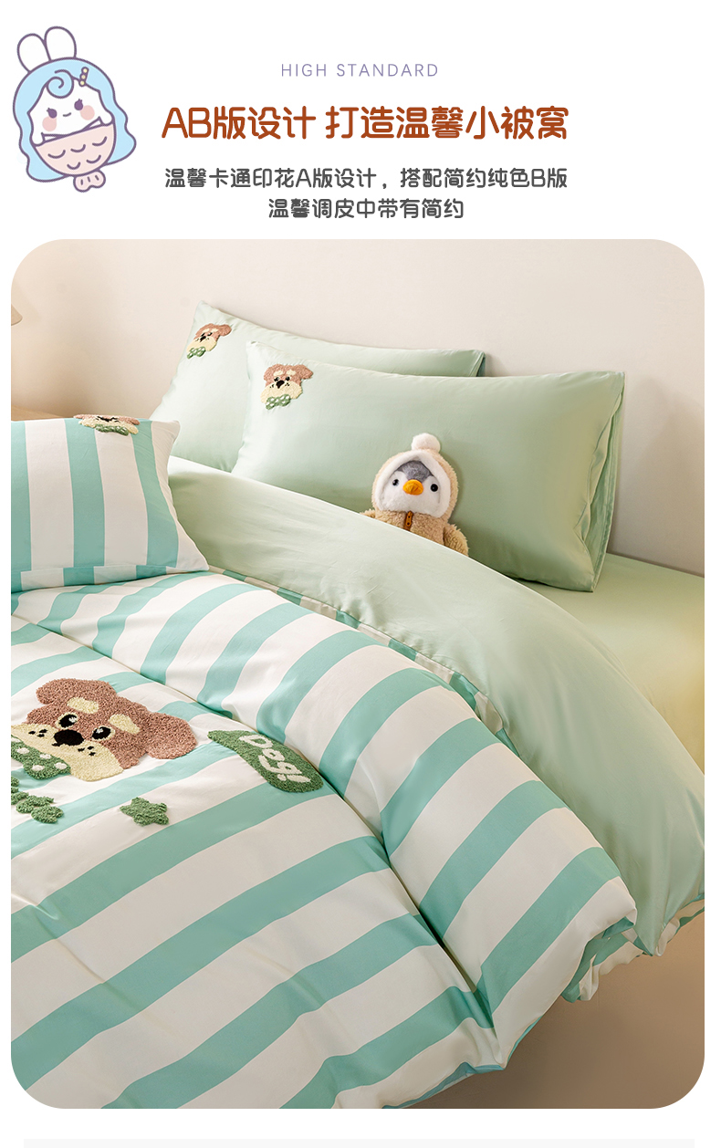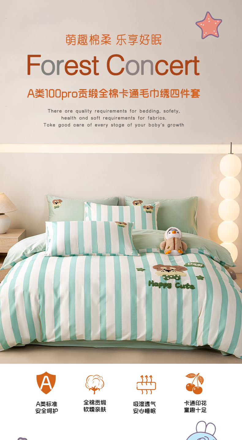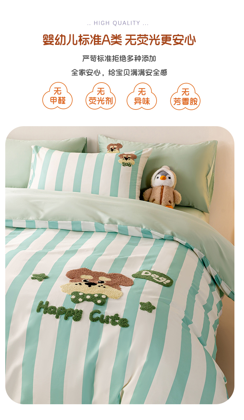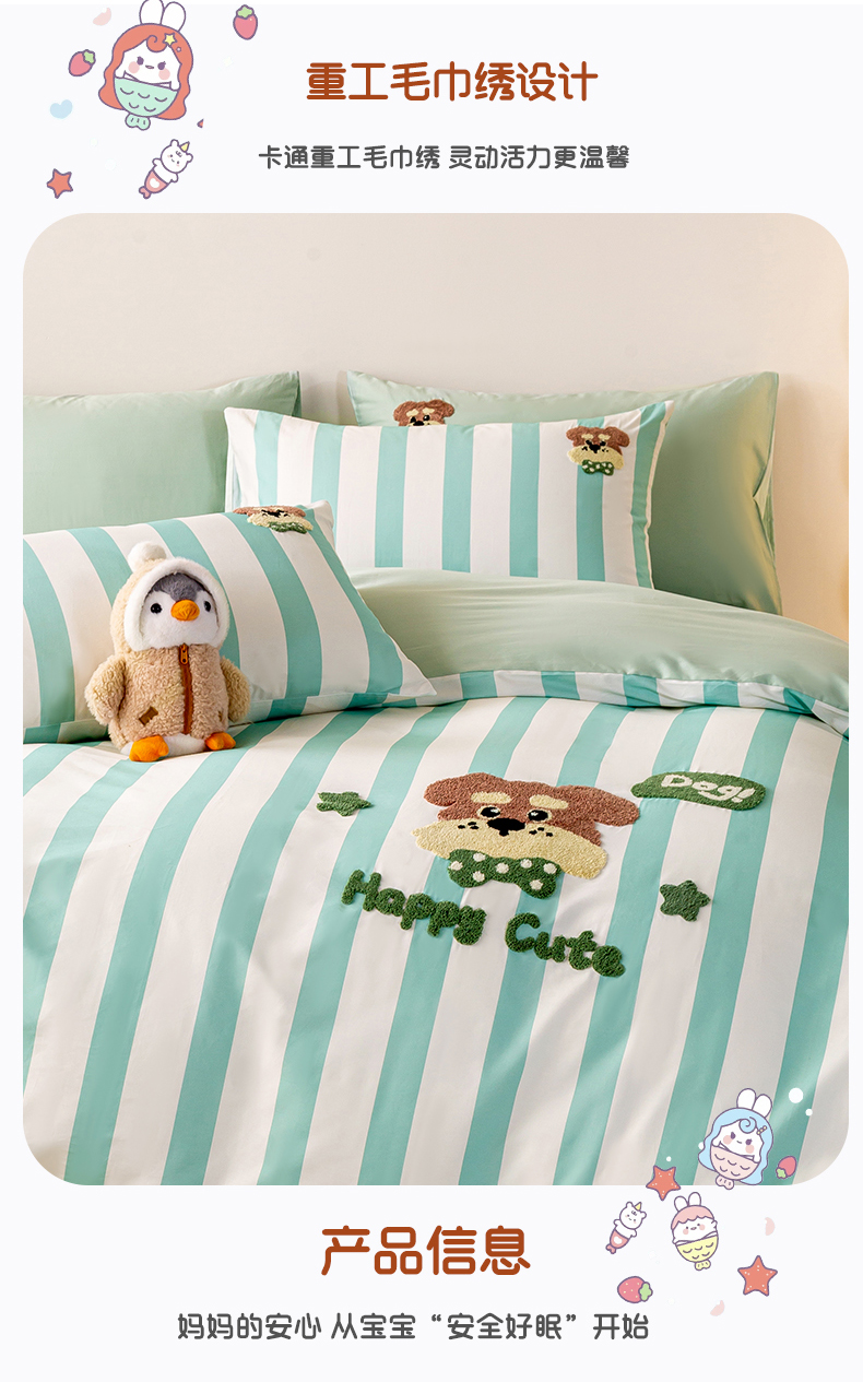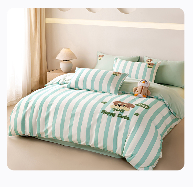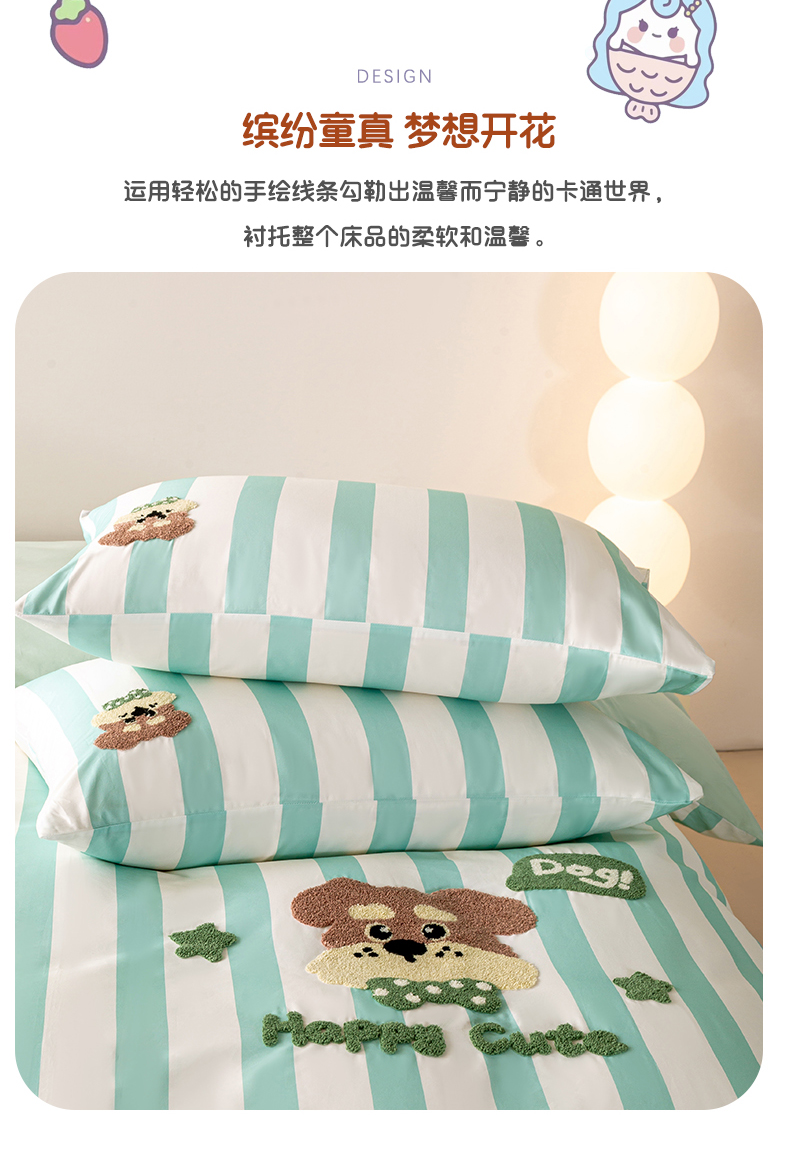 当前位置: 91家纺网 > 商品网购 > 床品套件 > 四件套 > 全棉普通四件套 > 卧趣家纺 2026新款A类100Pro贡缎全棉纯棉卡通毛巾绣四件套-场景一 条纹俏皮狗