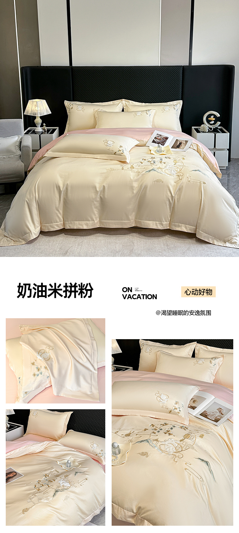 (总)绒掌柜家纺(品质焕新) 2026新品100S长绒棉精密贴布刺绣四件套-月夕花朝系列-版权产品-礼盒装,奶油米拼粉,高级粉,奶油米,香芋紫