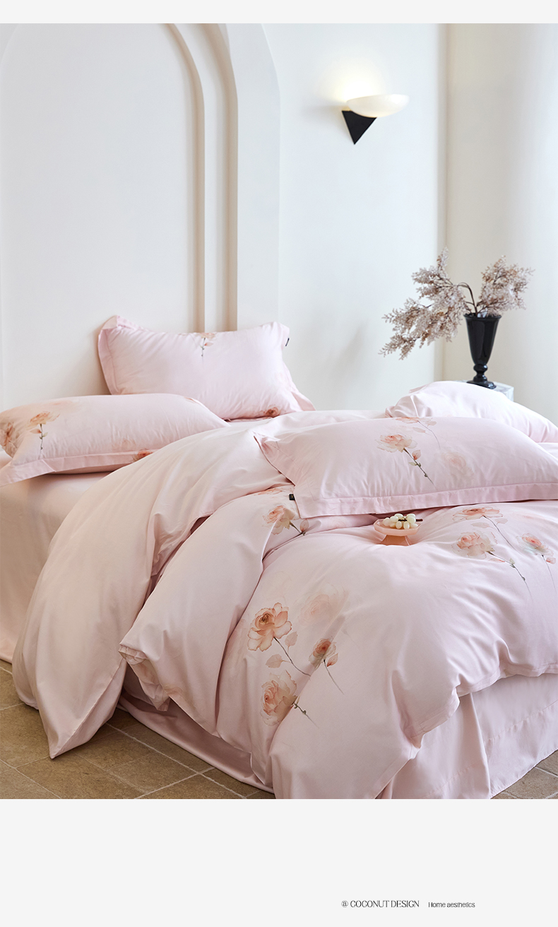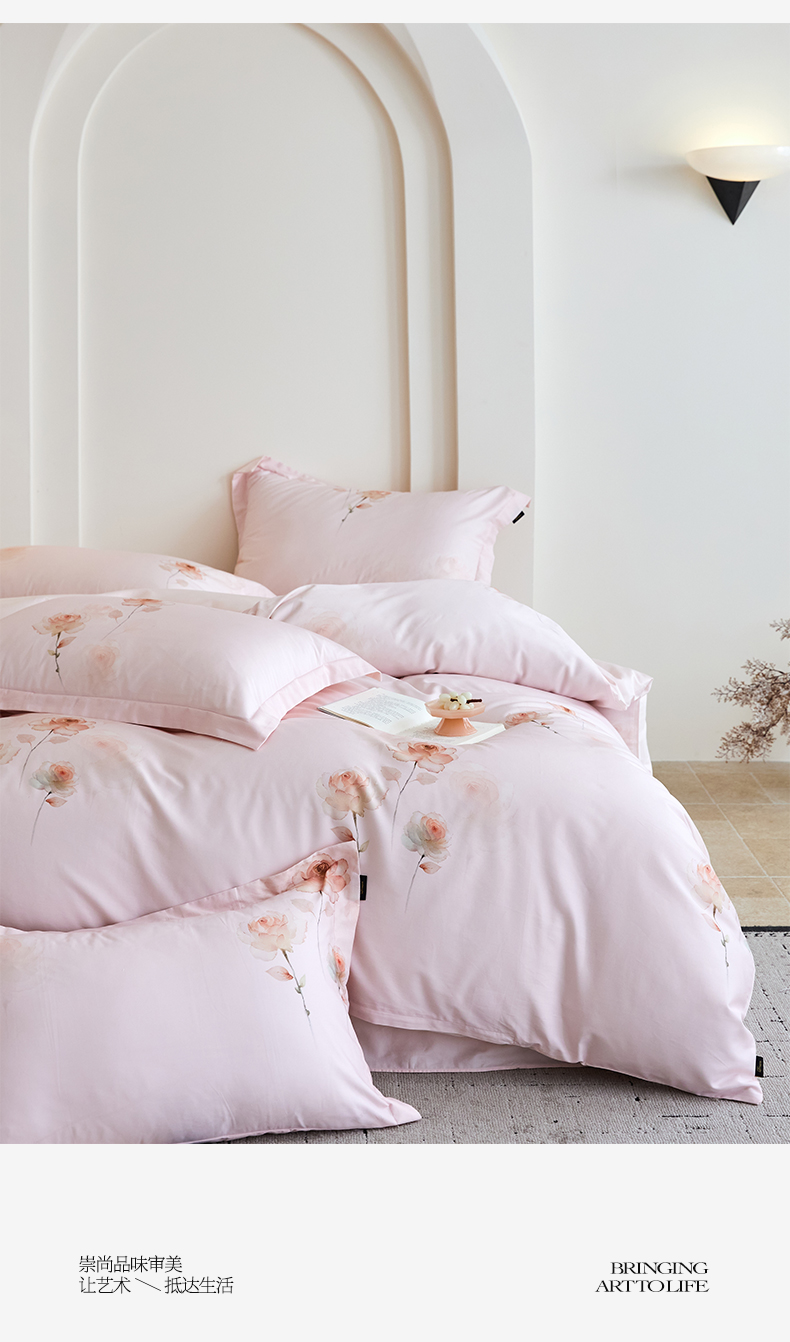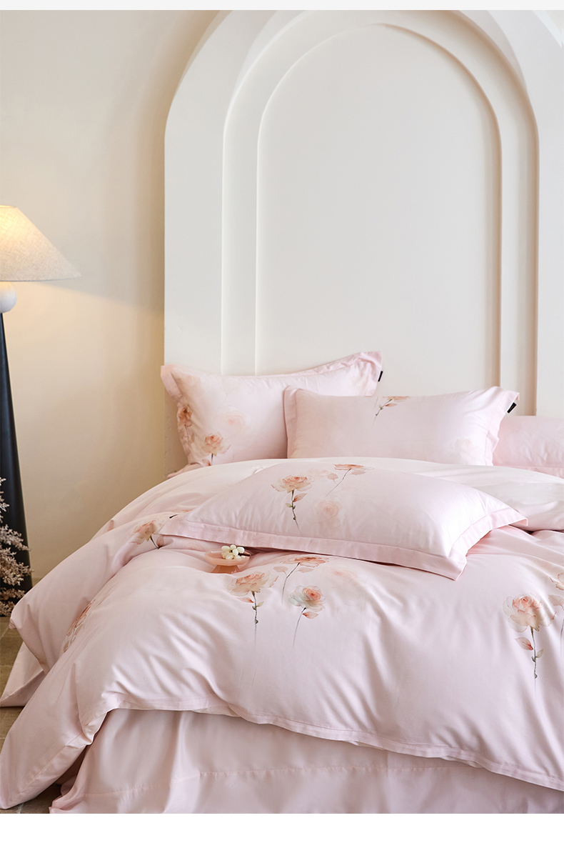 帅露家纺 2026新款全棉60支长绒棉数码印花四件套 蔷薇花语粉